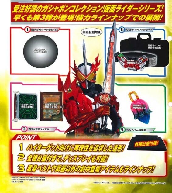 New set for the 1/12 rider items set thing seems to be the two Woz books, a Helheim fruit (don't eat it!), and the W driver and its briefcase. The 4th one being hidden, but since Saber is present I suspect it being Nagare or Kurayami.