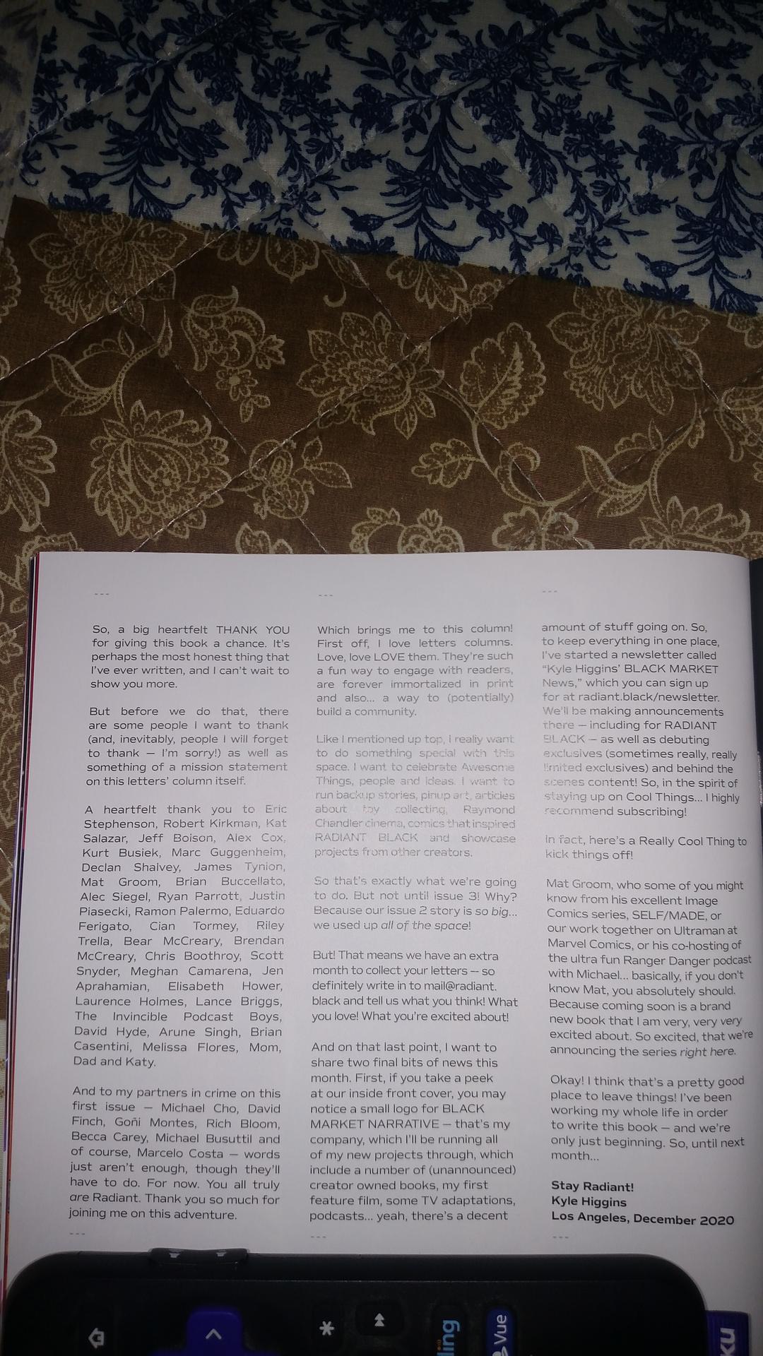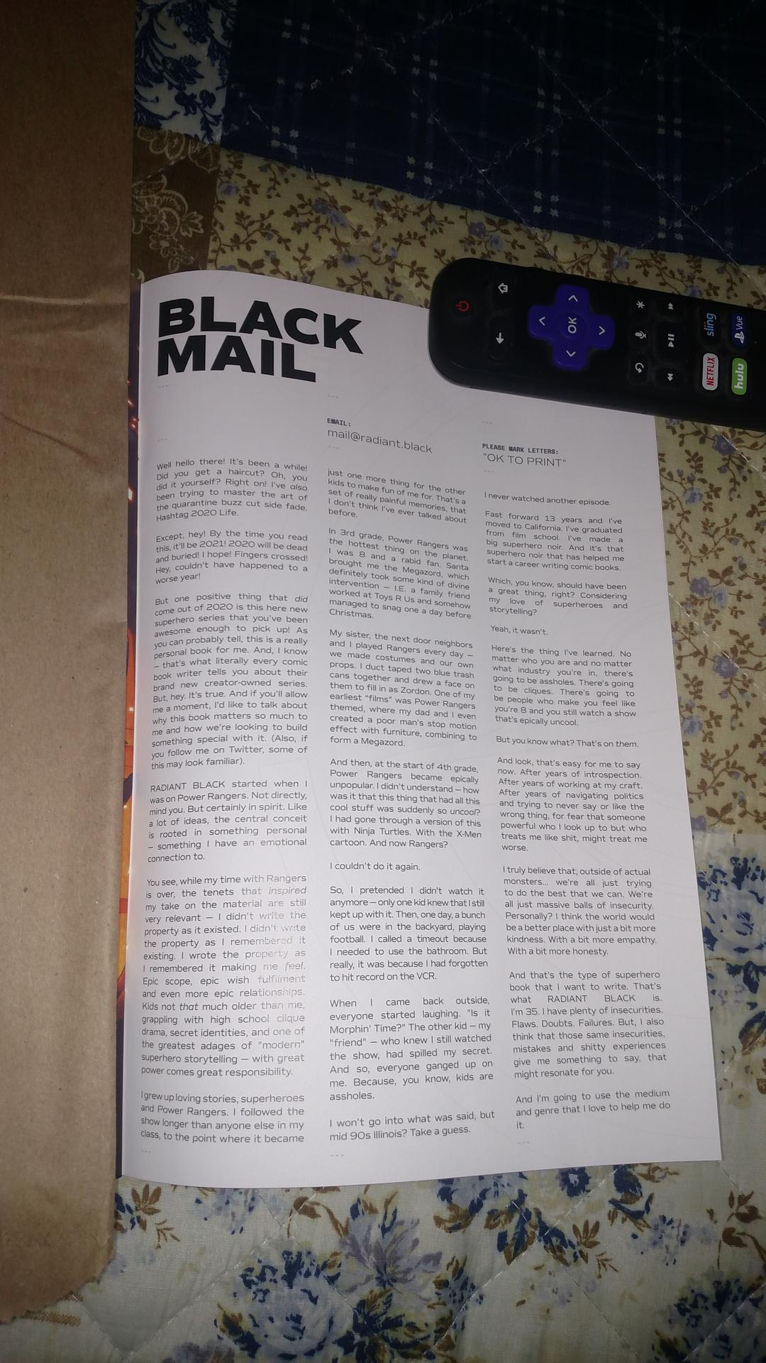 I can understand someone who hasn't gotten everything to fit together and who's not where they want to be in life. I'm a college grad and I have little to nothing to my credit. The premise behind this book feels real and genuine. I don't want to give much away, but this is definitely more adult in tone and it's predicated on the character drama and heart of the characters. I'm interested in more of this. I do want to point out Kyle Higgins' comments at the end. It really speaks to a lot of us here. Higgins had those around him who gave him grief for his love of brightly colored teenagers with attitude and I myself grew terrified of spreading my love for that same franchise around back in high school (though I was in a mostly Sentai mood as a Senior). There is a lot of Higgins that I can understand and that's why I'm including images of the "Black Mail" from the back of Issue 1. Of note, I decided to omit a key image from the last page for the moment. You really need to read this book, if only once. Last edited by TokuKnight89; 02-11-2021 at 12:11 AM.. |