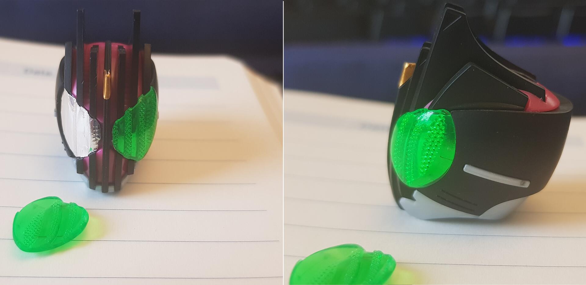 The right eyepiece just doesn't stay in place, and I can't figure out why. The vertical pieces are all properly set (and you can see in the pic where I've scuffed them a bit making sure they're flush) and the shiny sticker is correctly positioned. The left eyepiece clips in fine, and I can't see anything different between the two sides. What am I missing? Or should I just give up and glue it? |