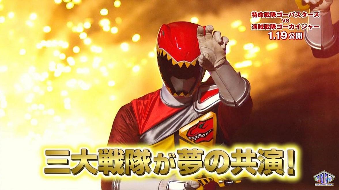 Thanks to blog Orendsrange we've gotten our newest (and best) look at Juuden Sentai Kyoryuger! These screencaps come from the latest trailer for Tokumei Sentai Go-Buster vs. Kaizoku Sentai Gokaiger The Movie and detail the first appearance and battle of the Kyoryugers! Check out these awesome shots of the Kyoryugers busting out their Gaburevolvers on some Zangyack Gomin! Gobuster Vs. Gokaiger is in theaters January 19th, 2013!