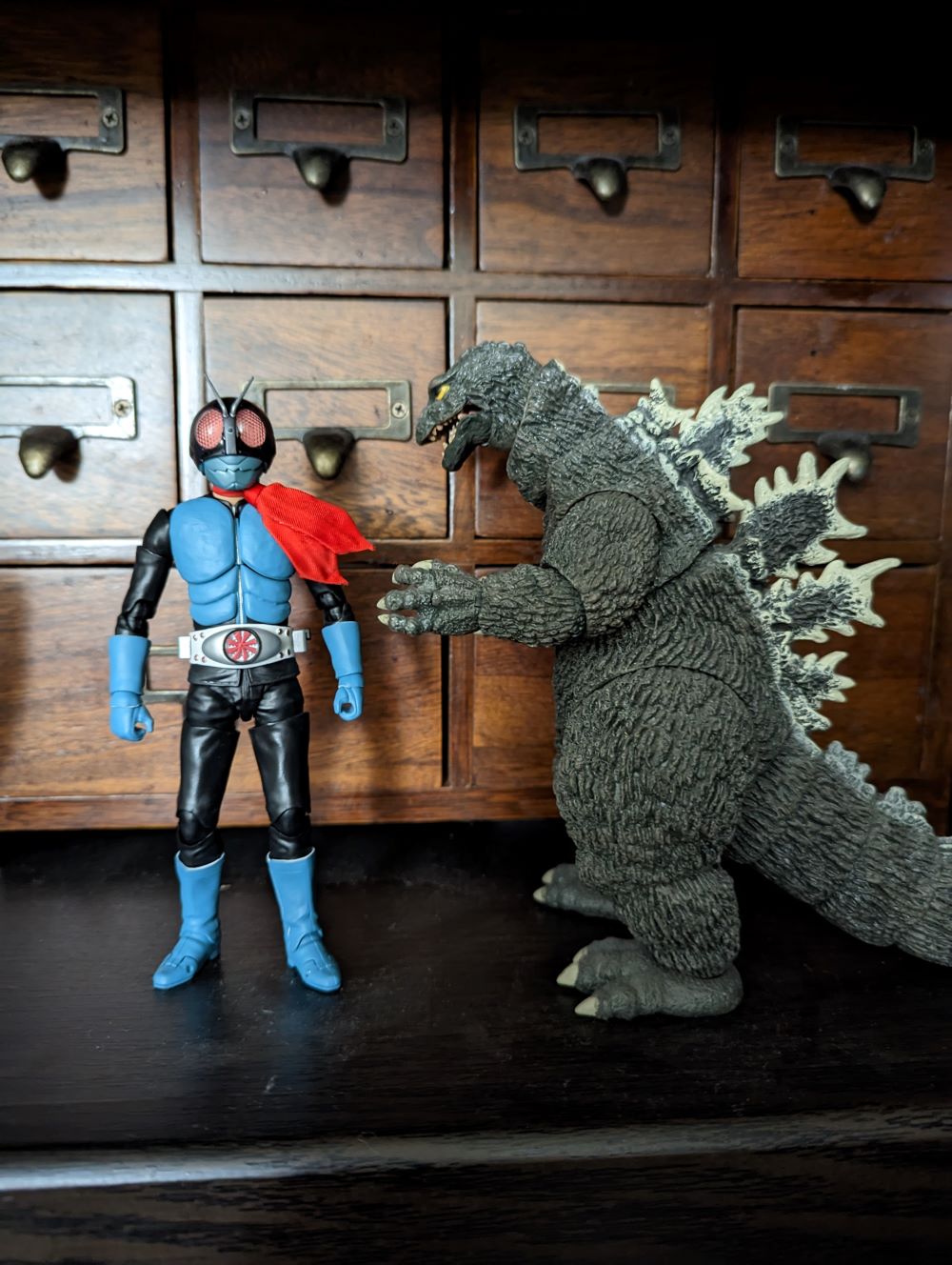 So with that in mind, Akarenger, Ichigo, and OG Ultraman is what I'm aiming for. I also like the idea of maybe pairing Black and Shadow Moon together, but since I already have Akarenger, I want to build my display around his presence. If need be, I suppose I'd be open to a more modern version of the original, for example Shin Ultraman. When it comes to Godzilla, I'm more flexible. My number one pick would be '54, so it's a collection of all of the firsts. After that, I think maybe any other Showa-era design - while not the first, it'll still be similar in era. In fact, some of the late Showa designs kind of feel more "tokusatsu" to me than '54, so that's a nice bonus. Realistically, though, any Godzilla would likely do the trick. I really love Shin Godzilla, so that might be a nice choice....to pair with Shin Ultraman. And hopefully an upcoming Shin Kamen Rider? And I have tons of Eva figures...but then where does Akarenger fit in? Do you see my dilemma? ![]() One thing to note, though, is I want Godzilla to be taller than the other figures. Those NECA figures are super cool, but are they tall enough? Quote: