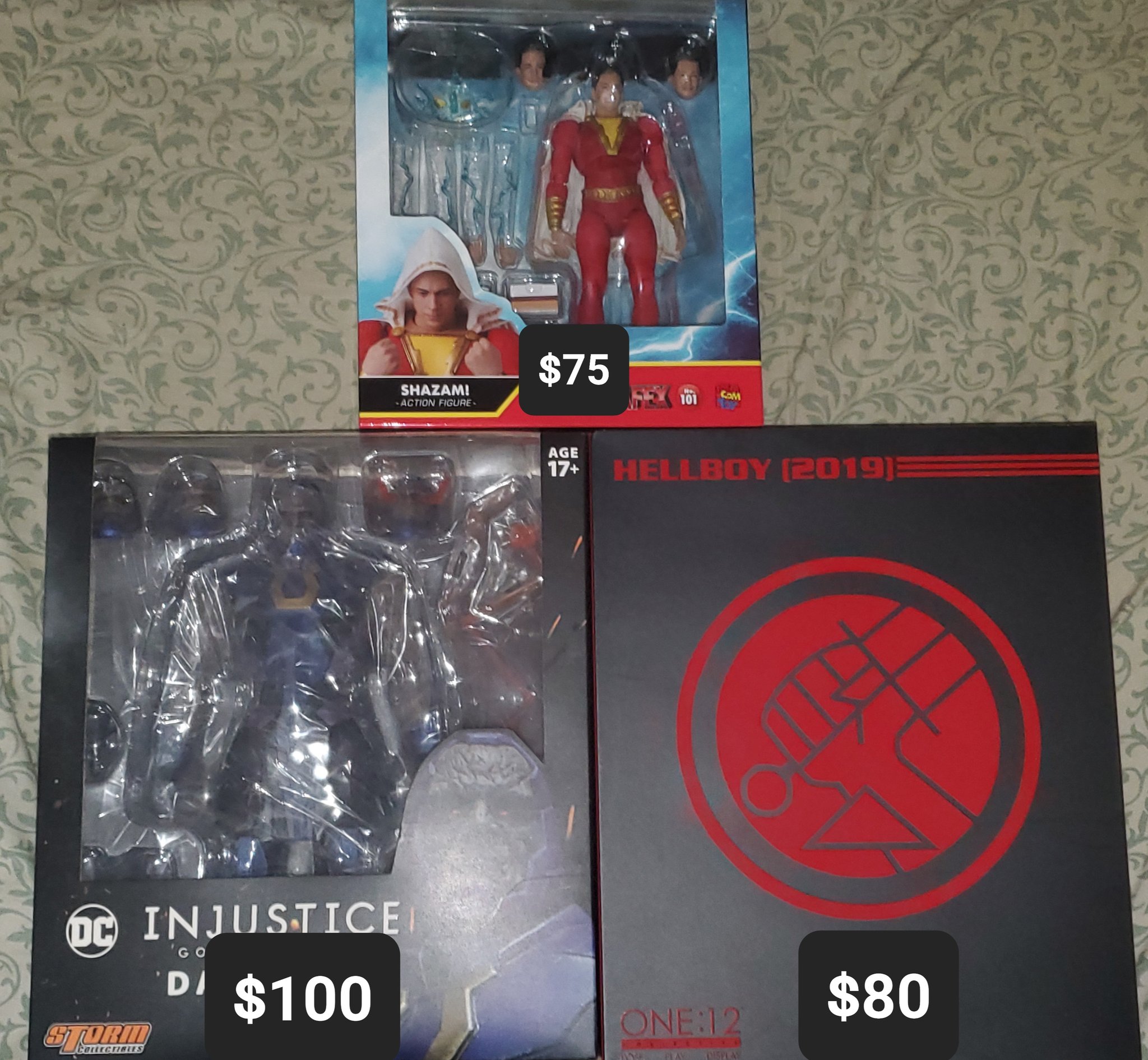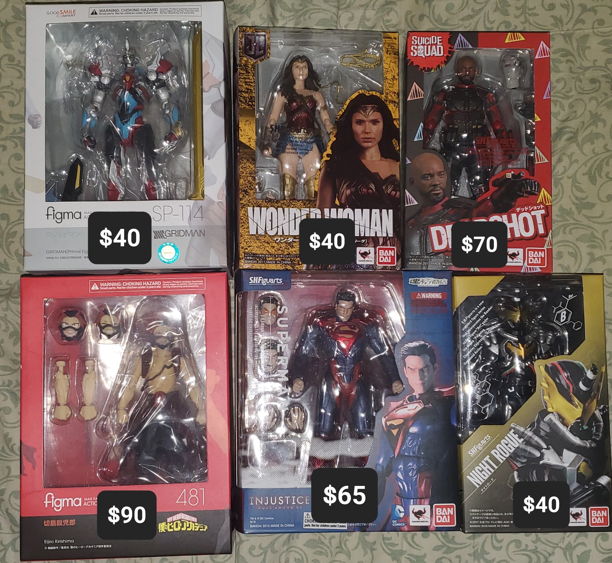 All items listed are preowned and have been open/displayed/photographed. US shipping only, apologies to anyone outside the US. Payments done through PayPal F&F. DM me with any questions or offers! BOXED: S.H. Figuarts Wonder Woman (Justice League Version): SOLD S.H. Figuarts Deadshot: $70 S.H. Figuarts Superman (Injustice): $65 S.H. Figuarts Night Rogue: SOLD Figma Eijiro Kirishima: $90 Figma Gridman (Original Release): SOLD Storm Collectibles Darkseid: $100 MAFEX Shazam: $80 Mezco One:12 Hellboy (2019): $80 DX Dynazenon: $130 (Has paint-scratching on cockpit) LOOSE: Mcfarlane Toys Hell Bat Armor: $15 Mcfarlane Toys Bat-Raptor: $20 Marvel Legends Deluxe MODOK: REMOVED Marvel Legends Melina Vostkoff: SOLD Figma Mahou Shoujo Lyrical Nanoha lot: Hayate [Broken hat piece] ($15), Vita ($20), Shamal ($20), All 3 for $45 For any questions on quality, please feel free to ask! Many thanks for taking a look!
