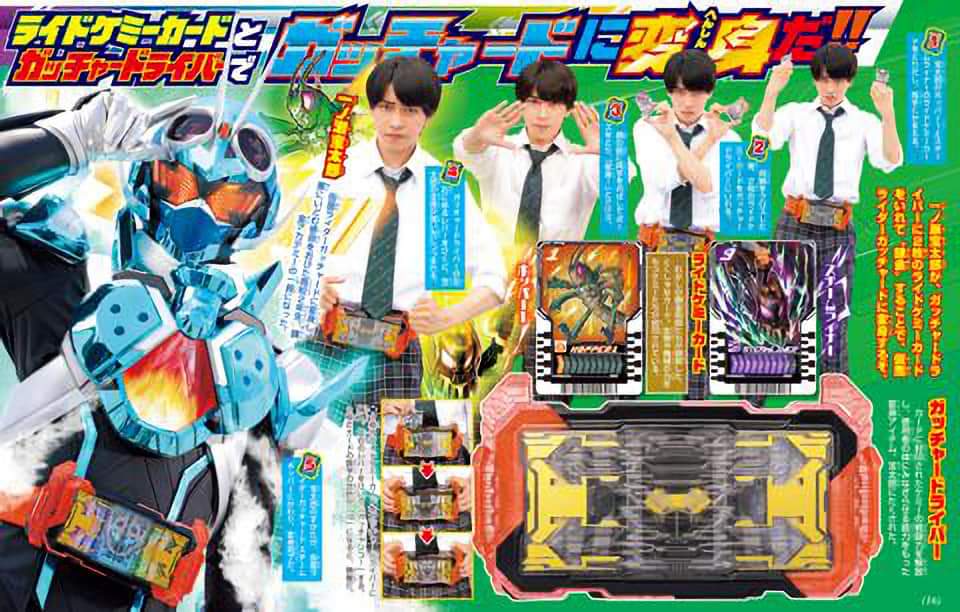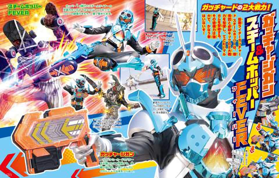 Here's the Gotchard scans for September and some things worth noting are steam liner's wild form (although we've already seen that in the sodo & shouchaku henshin set), our first look at venom mariner (which reuses the arm from kirin cyclone), in the top right corner of the image with the bike it shows off a device that allow Gotchard to summon chemies (it's how he is able to use the bike), and in the image with Valvarad he is shown fighting Gotchard.