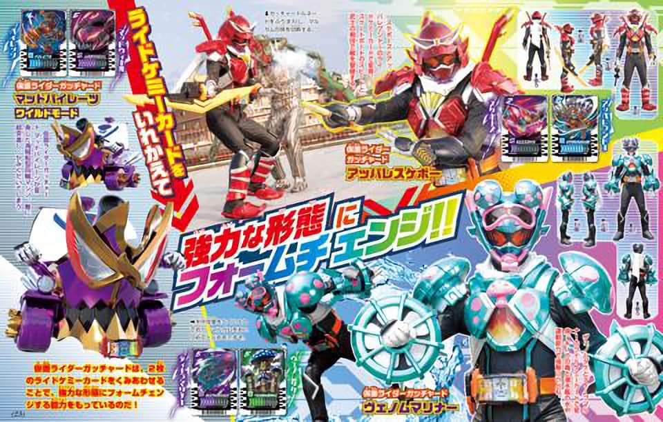 Here's the Gotchard scans for September and some things worth noting are steam liner's wild form (although we've already seen that in the sodo & shouchaku henshin set), our first look at venom mariner (which reuses the arm from kirin cyclone), in the top right corner of the image with the bike it shows off a device that allow Gotchard to summon chemies (it's how he is able to use the bike), and in the image with Valvarad he is shown fighting Gotchard.