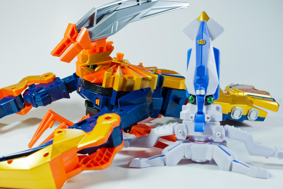 Tokunation continues it's rewind of the Samurai toy line, this time with a gallery of the Clawzord and Octozord! The Clawzord in lobster mode is fairly large for it's price point and is a faithful adaptation of Shinkenger's Ebi Origami. With the help of some symbol power, this lobster can transform into the Claw Battlezord. This megazord has the ability to access 4 different modes, signified by a change of face and weaponry. Claw Battlezord East uses it's mighty claws, West utilizes it's tail as a fan, South uses it's antennae katana to slice and dice adversaries, and North combines with the Octozord to perform frosty attacks. The Clawzord can combine with the Samurai Megazord to form the Claw Armor Megazord. The octozord figure is drastically smaller than the Japanese Ika Origami figure but can still combine with the other zords to form fairly accurate representations of the Octo Spear Megazord, Claw BattleZord North, Samurai Battle Cannon, and of course, the Samurai Gigazord.