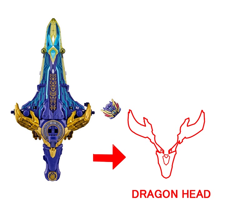 It seems the Ryo Tegasword's horned dragon head motif is located in the sword grip with two hands decorations.
