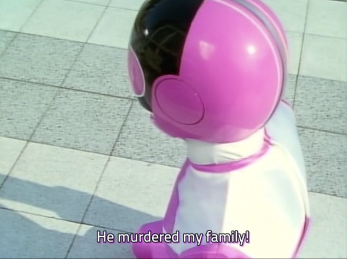 Timeranger Case File 05: The Third Combination, 12/03/2000 We open at Londarz Prison, in the dead of night. While the others sleep, Gien awakens a prisoner of his own volition. Blast assumes that Dolnero has had him thawed out to eliminate a witness to his dirty dealings (I guess he hadn't noticed they're a thousand years before most of those took place, despite somehow knowing that the guy unfreezing him was an associate of Dolnero), but Gien sets him straight. Dolnero has forgotten he even existed, which Blast is glad for, since he prefers to kill for the fun of it rather than for money. To which Gien makes him a proposition. The next day, Sion is playing a flash game on the computer (if this is a real game, somebody tell me. Though it likely is, since I doubt the CGI budget amounted to creating a scene like this). Tatsuya and Domon come in having just woken up. Tatsuya is amazed that Sion is already up, only for Domon to tell him that Sion never went to bed. As Ayase gets up, Sion reveals that Yuri left early to take up a cleaning job, to Ayase's concern. Domon blames Tatsuya saying they'd do anything on the job poster, which the latter justifies by pointing out that they can't make a living wage off only 5 jobs. Meanwhile, at the Downhills, Yuri has actually made strong progress with the mopping. But then the men show up, offering to help her. Soon enough, the men are doing all the work, and Domon has decided that Yuri's tomboy tendencies make her the one type of woman he wouldn't want to do (If you think that's an issue, it's still less of a grievous one than the fact someone coloured Sion?s hair blue in this scene). Meanwhile, out in the town, Lila goes out to do some shopping with the money Londarz have acquired, wearing a disguise (which does nothing to cover up her cotton candy pink hair, but maybe they assume it's dyed). Nearby, Blast begins his rampage, indiscriminately gunning people down with his gatling gun arm, and tearing a Rolex off one of his victims. The Tomorrow Research gang realise there's a commotion when people come running into the building they're cleaning, and head out to investigate. Nearby, Lila's attendants - actually Zenits - are gunned down and her wares destroyed, making her made enough to drop her disguise and kill Blast on the spot. But then Timeranger show up, and she decides to let them handle it, vanishing from the episode. But during the fight, Yuri gets a very good look at a bangle hanging from Blast's body, a trophy from one of his previous kills. And the sound of his footsteps echoes in her mind. Yuri proceeds to drop her emotionless demeanour and charge towards Blast, her thoughts filled with murderous rage. After ruthlessly beating Blast to the floor, Yuri summons her VolSniper and sets it to full power, before preparing to fire. But the others step in and stop her, allowing Blast the opportunity to get away. As the others chide Yuri for losing her cool, the last thing she should be doing as a detective, she reveals why she's so seemingly willing to murder this particular scumbag over the arsonist, the bank robber or the child killer. Later back at the loft, Yuri refuses to elaborate on her tragic backstory beyond the dead family consisting of her father, her mother and her younger sister Mei. So Tock explains. He then notes that Yuri's life took a turn for the worse when she was 10 years old, in 2988 (so that makes her 21-22 during the events of the series. Not necessary to know, but still a fun fact). Yuri was heading to meet up with her family (I assume she was heading home from school, since no other options make sense)? But then a mysterious figure emerged from the shadows and gunned down the whole family. Yuri survived, because she was hidden beneath her father?s corpse after he?d run forward to shield her from being the first to die, realising what had happened when she climbed out from beneath him. But Tock points out that despite Yuri's opinion on the matter, there's no proof as to who committed the crime. Least of all, if it was Blast. (Judging by the date in his arrest record, he got busted shortly after the murder of Yuri's family. So he clearly wasn't competent at much other than killing). But Yuri insists that it was him, because she recognised his voice and the sound of his boots from the killing. She then notes that she didn't become a detective to avenge her family. Her father and her made a bet that if she became an Investigator for the Intercity Police and did better at it than her old man, then he'd let her inherit his bracelet... the same bracelet she saw hanging from Blast. And since her father was also an Anti-Mafia Investigator, she's sure that Blast was the hitman, and he was hired by Dolnero. But Tock points out that jumping to conclusions and using them to justify murder is poor etiquette. And Domon then suggests she sleep on the matter. But Yuri is haunted by visions about her family vanishing from around her, while Dolnero laughs at her. As the others try to think of how they can help Yuri shoulder her burdens, Yuri thinks back on the promise she made to her father shortly before she died to become a great investigator. The next morning, Blast attacks a theme park, an act that Sion wakes everyone up to relay. But this causes Yuri to charge on ahead, equipping her Chrono Suit and heading off alone in the Time Flier. She arrives at the amusement park to stop Blast from killing the clientele, beating him down once more, and pointing her VolSniper at him, once more increasing its output. The others arrive and beg Yuri not to kill Blast, since doing so will make her a criminal. Yuri seemingly doesn't listen, once more insisting that Blast murdered her family. And he actually confesses to the crime, but notes that he wasn't a lone agent. (The moral here? Probably that police brutality and vigilantism is a great way to extract a confession) The ring turns out to contain a holographic message from Dolnero (who amazingly, ha