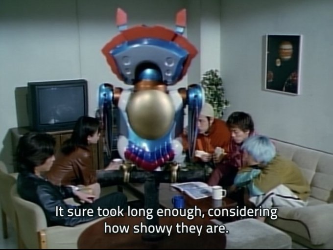 Timeranger: Case File 09: The Don?s Depression, 15/09/2000 We open with a bit of reality sweeping in, as the Londarz are exposed to the public by a tabloid magazine. Discussing this over breakfast, the Timerangers agree that this turn of events was inevitable. But they'll have to be on their guard. After all, who knows what these journalists might uncover? But that gives way to everyone heading to their jobs... except for Ayase, who goes to take his driving test (so I'm guessing those documents Tock and Sion were forging just allowed him to take the test?). Cue a montage of Timeranger at work. But then we cut to Casa de Dolnero, where Lila is sick of the Sentai trope of carrying on with their operations as if the heroes don?t exist and won't stop them every time (I know how she feels). Gien then gets an idea after finding one of the criminals they have frozen is a police officer, and decompressed him, with the name being a bit of a hint as to what he was busted for. And by ?brother?, he means in the street sense (apparently, that?s universal enough to exist in Japan). He reveals that he used his position as a police officer to help pass hints to Dolnero's gang back in the future. And as Gien points out, he obviously didn't do a very good job since he was arrested. Despite being dismissive of his "Brother's" new crew, Arnold willingly goes out to gather money, as Dolnero returns to his apparent craft model building hobby. Meanwhile, back with Ayase, unlike Lucas during his test, he has a competent and appropriate instructor. But the lesson comes to a screeching halt when Arnold attacks motorists, demanding they hand over exorbitant fines for alleged infractions. Ayase sends the instructor away, before transforming and moving to battle Arnold. The others arrive, and battle Arnold until he decides to withdraw and regroup, leaving the heroes to escape the paparazzi. Back at the prison, Arnold talks with Dolnero, getting an answer as to what the model he's building actually is. Arnold then flaunts his old friendship with Dolnero to insult both Gien and Lila, causing both of them to leave and grumble about how much they hate the smug bastard. And then as they agree they're going to kill him, Dolnero overhears this, and decides to take action. So he provides Arnold with an upgraded weapon (wait for it). Arnold proceeds to go on the attack again, with the Timerangers finding out about it from Sion's hacking the police radio, of all things. They face Arnold, and Tatsuya gains a palpable advantage over him, forcing him to use his new weapon. But before Gien can take a shot and finish him off, the new weapon explodes, weakening Arnold, much to the shock of even the two regular villains. Sou Arnold weakened, Timeranger take the opportunity to blast their foe with the Voltech Bazooka, which... look, you all know the drill at this point. But the giant battle does stand out, because Arnold turns invisible to ambush TimeRobo. But they're able to come back from behind and win. Meanwhile, Dolnero confirms to his lieutenants that he sabotaged Arnold?s weapon. He explains that while Arnold is his friend, the other two are his family, and keeping harmony within the family comes first. Meanwhile, the heroes finish freeze-compressing Arnold, before the same paparazzo from earlier comes back, successfully taking photos for her editor. Unfortunately for her, they refuse to answer any questions and leave. Meanwhile, the heads of the police decide they need to do something about all those questions about whether the Timerangers are affiliated with them (They're already getting flak for talk that one of the Unidentified Lifeforms they're supposed to be neutralising is somehow stealing police equipment to slaughter his fellows). Their solution: Produce an article that confirms the rumours as "truth". Yuri doesn't mind the lie, since it'll help them operate in secret. But then Tatsuya changes the subject with some good news: Ayase passed his driving test and got his license. (And all it took was not having a biased instructor who took a minor injury too seriously) But during the celebration, Ayase's hand shivers, as he drops his wine glass, and he stumbles out, unnoticed by all but Tatsuya. The episode ends with him collapsing outside Tomorrow Research. Next week: Ayase explains the truth to Tatsuya: He's dying from Osiris Syndrome. This and more in Timeranger Case File 10: The Escape to Tomorrow. Final thoughts: I like the Dolnero plot with him being torn between his old friend and his new family (even if "Depression" doesn't really fit as a title), and the hook with Ayase is interesting, even if the trailer spoiled it. But I wasn't too keen on the subplot of the news reporting on the Timeranger's battles. Realistic? Probably. Interesting? I wasn't too thrilled. Last edited by Androzani84; Today at 06:23 PM.. |