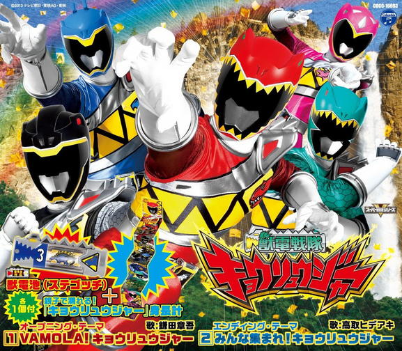 Thanks to Henshin Justice Unlimited members Deca End and Berty, here are the tv-sized versions of the opening and ending themes of Zyuden Sentai Kyoryuger! The opening theme is titled VAMOLA! Kyoryuger, while the ending is Minna Atsumare! Kyoryuger.