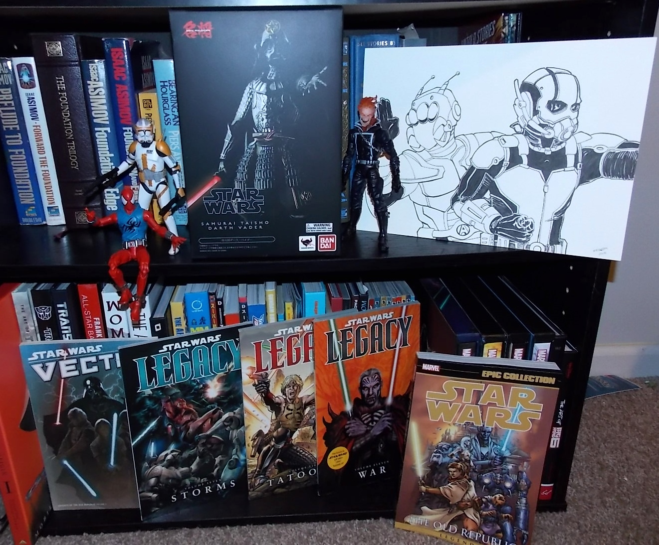 -The rest of the Star Wars Legacy trades I needed to fill out my run (Vector 7 8 & 11) -Black Series Commander Cody -Rhino Wave Scarlet Spider & Ghost Rider -Movie Realization Darth Vader -Knights of the Old Republic Epic Collection 1 -And an AMAZING sketch by my friend T16skyhopp. Thats the Avengers United They Stand cartoon & MCU versions of Ant-Man posed as Showa Riders 1 & 2!