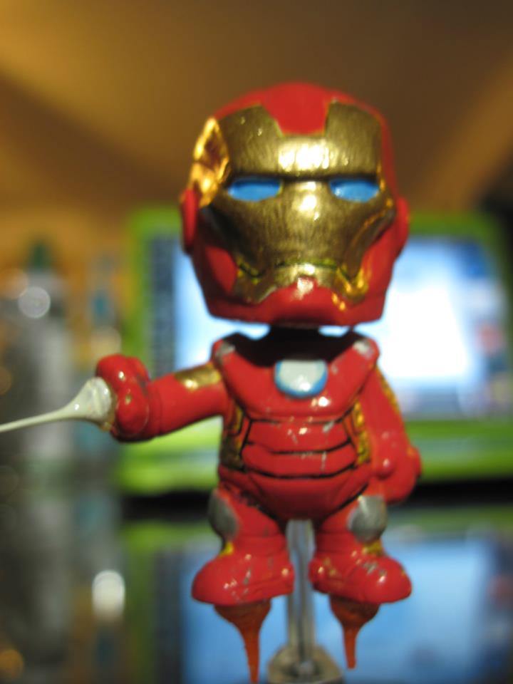 I painted Iron Man to look more like he does on screen. Blue eyes, gold, silver, and shiny red. And then I added hot glue effect parts for the repulsor blast and thrusters. I had an extra hulk, so I also made a Red Hulk.