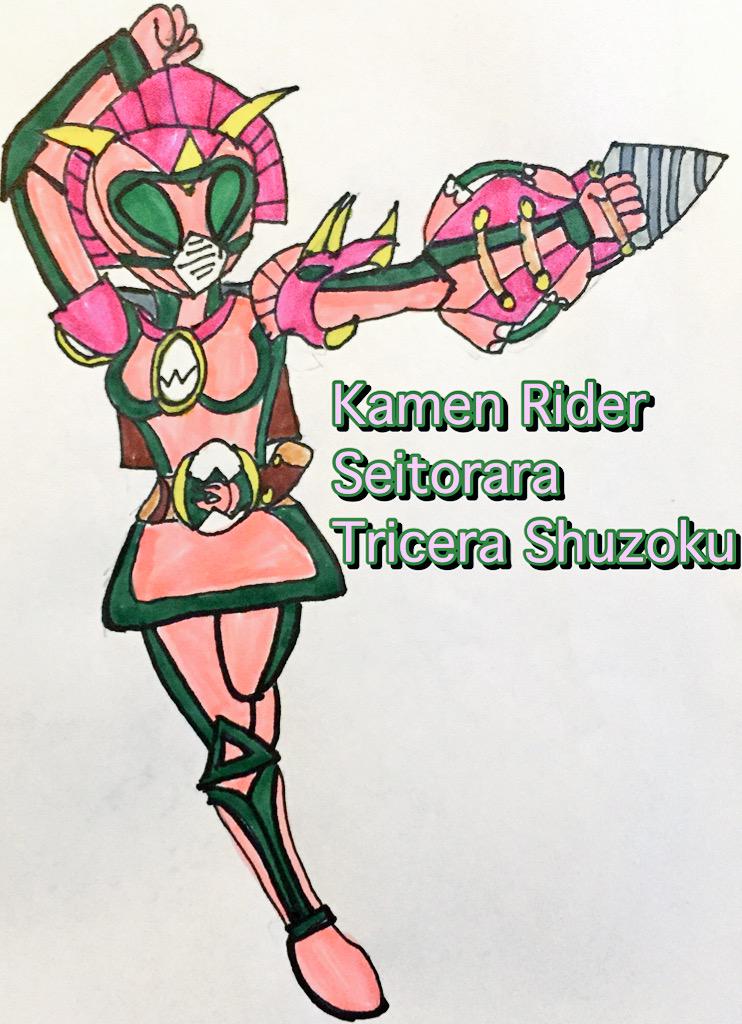 Kamen Rider Seitorara ![]() As the threat of the Fauxils grew, a second X-Ten Buckle was created by Zetsu. When the original intended user for it proved to be too weak, this young woman took it for herself and transformed! Spirited and reckless, she joins X-Ten in the fight! And just like X-Ten, she uses DinoKins! Seitorara transforms using the "Tricera" DinoKin to assume her default green and pink Tricera Shuzoku form. Unlike X-Ten's base Pachy Shuzoku form, Seitorara has a weapon, causing her TamagoKata shoulder pad over her left arm to "hatch" instantly during transformation, arming her with the TriceraHorn Defender, a shield/drill combo weapon. With this, she often uses it to deliver devastating punches to her opponents. The finishing move of this form is To The Top, where she uses the TriceraHorn Defender to uppercut the opponent, sending them into the sky as she punches the ground, causing debris to break off into the air. Jumping from piece to piece, she makes her way to her opponent before delivering one last devastating punch. In an area without a breakable piece of the ground, she just uppercuts the opponent, then uppercuts again as they come falling down. Lets take a look at another X-Ten form next!