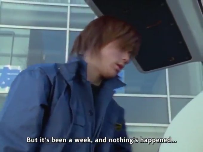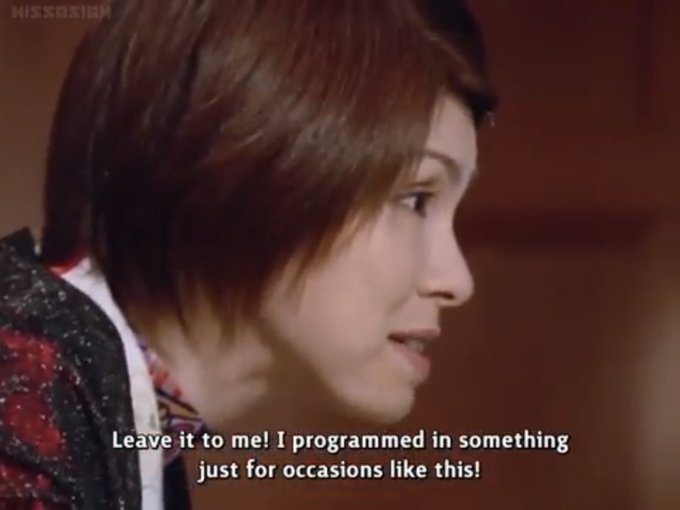 Since this is a milestone episode, I’m going to include some pictures this time. Though I had to watch the episode twice in order to get them. So we start where last episode left off, with Hamster Headmaster regaining his speech and the Jakanja’s arrival. This time, Furabijo summons the other villains to join her on the battlefield (Note that Sargain had dialogue in this scene, but I just didn’t take the picture at the point he was saying it. And yes, we already introduced all these guys last week. I don’t know why we’re doing it again) Nanami then asks who they are, (Really? Who do you think they are?) so the obligingly introduce themselves (Then why are there only 5 of you?) The Jakanja then proceed to attack our heroes, with Chuzoobo using a giant staff and Furabijo causing an explosion with her hand. But our heroes survive thanks to the empty suit switcheroo, and liberate Hamster Headmaster. One week later, Oboro is being berated to work on something by her dad (so even as a hamster, he’s still an asshole. Good to know). And we learn that he’s stuck in the body of a hamster because he mispronounced his own spell. (Make of that what you will). We then show what our heroes are up to, with Nanami having her priorities in order. She is then abducted, er scouted by a talent agent, who decides she is what he’s looking for. He then gets her clothes off (not in that manner, you dirty devils), including her Hurricane Gyro. Meanwhile, Yosuke has become a window cleaner. One with an extremely horrible Union, it seems. The boss basically tells him to shut up and get to work on those windows (not answering the question, I might add). He then chooses to grumble about his situation. (Gotta say, he does have a bit of a point here. It might be a bit more productive to locate and destroy the Jakanja, rather than wait for them to attack and then destroy them) He then sees that Kouta is walking into a pre-school, and decides to investigate (he is so fired). At the Centipede, Tau Zant wants to corrupt the planet further until he can get around to finding “that” (I don’t know, seems counterproductive). Sargain then insists that his puppets will make up for Chuzoobo’s failure. When Chuzoobo takes umbrage at this, Sargain decides to say it to his face, leading to this reveal. Yep, Sargain is controlled by a tiny insect who sits in his head. It’s as freaky as it sounds. With that settled, Sargain proceeds to awaken his first puppet, having been given the greenlight from Tau Zant. We then cut back to the pre-school, where it turns out Kouta is now a physical therapist for a disabled girl. It’s a fairly wholesome scene, until Yosuke notices that Kouta isn’t wearing his Gyro. And because, as Disney says, it’s a small world after all, the two then see Nanami performing at the same pre-school, singing a song that seems specially written for her. It turns out she’s stuck performing enka (I don’t know enough about JP culture to explain what that is, but I assume it’s basically performing at pre-schools), and to add insult to injury, she’s a substitute. Yosuke then notices that she’s not wearing her Gyro either (apparently, they’re going out of style). Elsewhere, Jishakumo attacks, magnetising people to each other and turning them into metal. Oboro sends out the distress signal to the Hurricanegers, but only Yosuke hears it. Seeing the other two joining in the pre-school activities, he leaves without them. Arriving at the scene of Jishakumo’s attack, Yosuke states he can take on the puppet by himself. This being a show based around friendship, of course he can’t and ends up trapped between several metal objects. To get the other two into the fight, Hamster Headmaster orders the distress frequency to be amplified, alerting the other two, who show up to save Yosuke and tell him that they don’t want to quit at all and they won’t take their Gyros off again (man, the episode isn’t even half over and we’ve already resolved the main conflict. I think that’s a record). Jishakumo cares not for their reconciliation and continues the fight. They hit him with their Hayatemaru swords, but it does bugger all and he gains the upper hand quickly. But then Oboro realises he’s a puppet running on a power source and tells them to destroy that to kill him. Kouta then notices his chest glowing and suggests they hit that. They form the Victory Gadget, this time with the Quake Hammer as the front (last time, it was the Dry Gun) and crush Jishakumo with a 100 ton ball, destroying him. Furabijo, who was apparently there the whole time, then marks his performance If I remember anything from Ninja Storm, it’s at this point that they make him big by sending down the scro- What? What the hell is happening? Oh, so the growth method here is like Fiveman’s (a giant robot copying the smaller monster) but better (in that this one also does personalities and isn’t numbered, so you can feel free to do your own fanfiction using them without causing a continuity snarl) To face the copied Jishakumo, Oboro reveals her project, a set of Shinobi Machines for the current Hurricanegers: Hurricane Hawk, Hurricane Dolphin and Hurricane Leon. She teleports them onto an aeroplane, a cruise liner and a Ferris wheel (I wonder what happens to the people on those things). The Hurricanegers are told to use their Gyros to control them, leading to a battle. Jishakumo stands up to Hurricane Hawk’s fire attack and Hurricane Dolphin’s hologram tidal wave, but gets hit hard by Hurricane Leon’s attack, blowing him to pieces as our heroes stand triumphant But then Jishakumo uses his magnet powers to pull himself back together (literally), causing Oboro to reveal the Shinobi Machines’ secondary function: they can combine (dun dun dun) Fortunately, Hamster Headmaster is there to correct Nanami’s genre blindness by explaining how it works. And so, our heroes combine, and while you watch the video below m