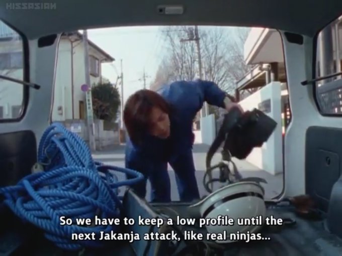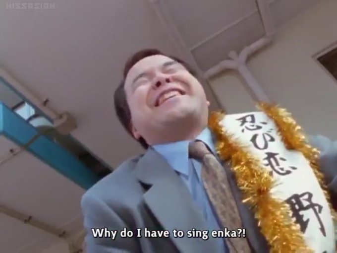 To face the copied Jishakumo, Oboro reveals her project, a set of Shinobi Machines for the current Hurricanegers: Hurricane Hawk, Hurricane Dolphin and Hurricane Lion. She teleports them onto an aeroplane, a cruise liner and a Ferris wheel (I wonder what happens to the people on those things). The Hurricanegers are told to use their Gyros to control them, leading to a battle. Jishakumo stands up to Hurricane Hawk’s fire attack and Hurricane Dolphin’s hologram tidal wave, but gets hit hard by Hurricane Lion’s attack, blowing him to pieces as our heroes stand triumphant EDIT: Also, to fill you in about not knowing what the heck enka is, here's a nice explanation from Japan Times: Quote:
