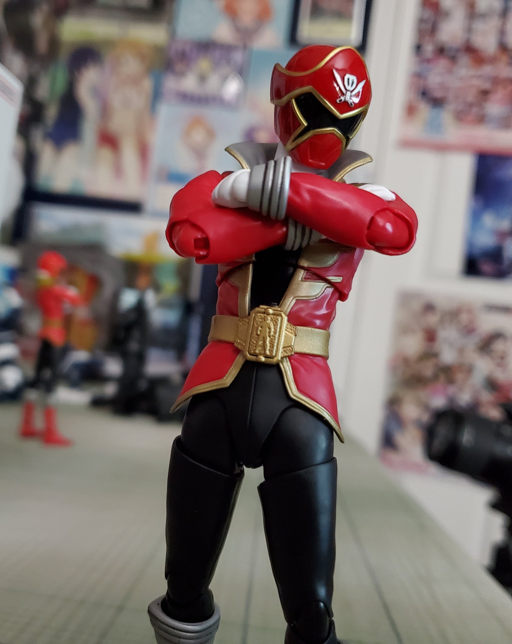 SS Gokai Red. Fantastic upgrade. All the hands he needs plus a roll call hand the original didn't come with. Better proportions. Better paintwork. Can naturally cross his arms with his own dedicated hand options for it. The keys can insert into the mobirate and weapons. And he moves fantastically. Feels like his biceps and shoulders were built off of V3's design. Very much recommended.