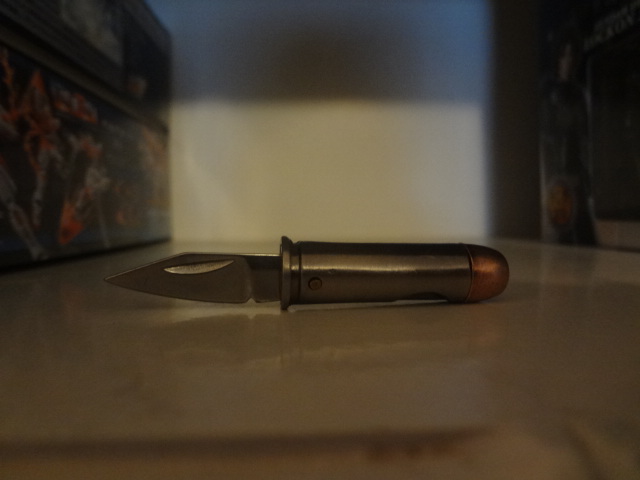 Gundams + nippers (I was supposed to get a Tieren too, but HobbySearch apparently didn't have it in stock and, instead of sending an e-mail notification saying so and refunding that part of the order, charged for it anyway and just stuck a note in the box.) And also in the "big badass robots" category: (I'm not impressed with NECA's quality as a whole, but it's really the only way to get the Jaegers, and I'm a MASSIVE Pacific Rim fan, so I decided to make an exception) And in the completely random category, I got a bullet knife! And some headphones: I also got the Minecraft essentials handbook and some hoodies, but I didn't photograph those.