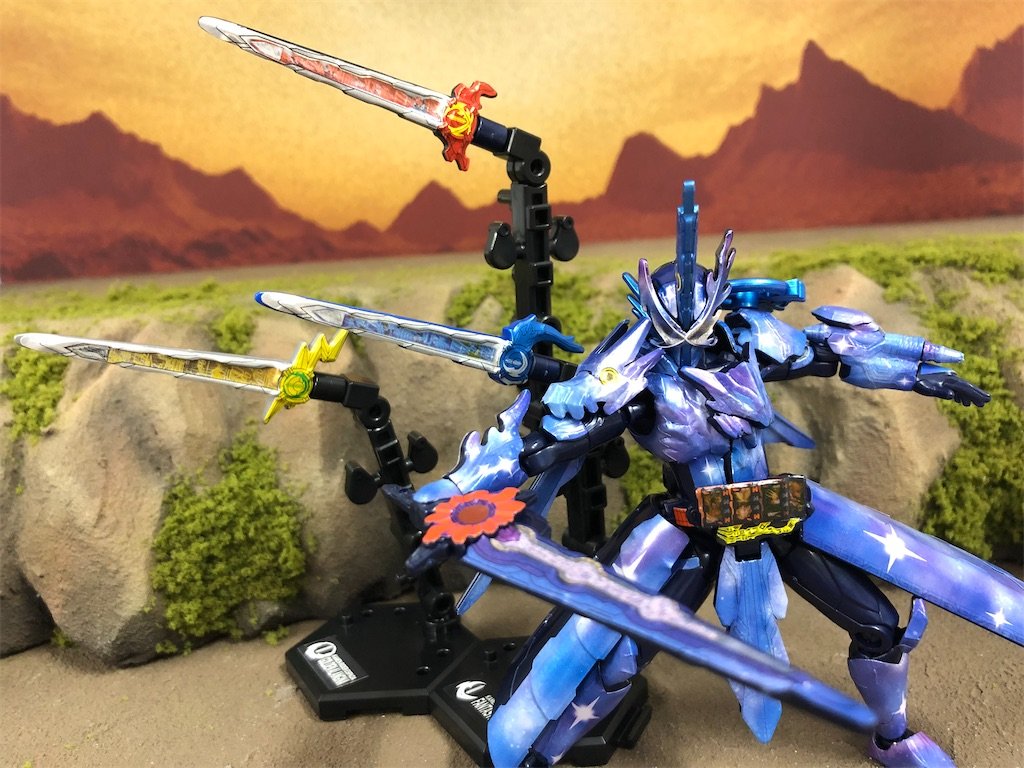 Next up, Crimson Saber! Neat!! What's even neater is the parts this guy comes with -- he includes two different swords with slider position set at Rekka/Nagare/Ikazuchi and Gekido/Hayate/Suzune; and a stand adapter to have the Seiken flying like he summoned them!