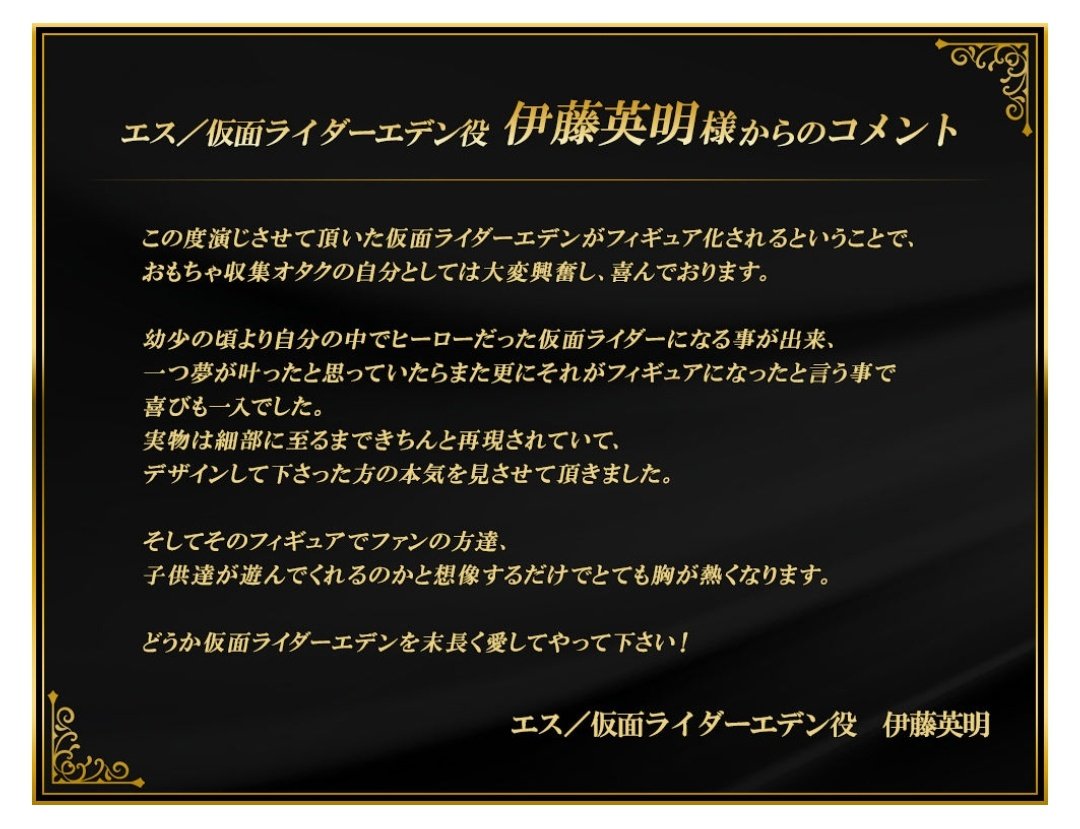 Excuse my loose translation. As a toy-collecting geek, I was very excited and pleased to hear that the character I played, Kamen Rider Eden, is being made into a figure. I was able to become the Kamen Rider that has been my hero since I was a child, and I thought that my dream had come true, but now that it has been made into a figure, I am even more delighted. I was able to see the seriousness of the person who designed the figure. And just thinking about the fans and children playing with these figures makes my heart beat faster. Please love Kamen Rider Eden for many years to come! Hideaki Ito as S/Kamen Rider Eden Please, LOVE Eden for a long time![/I]