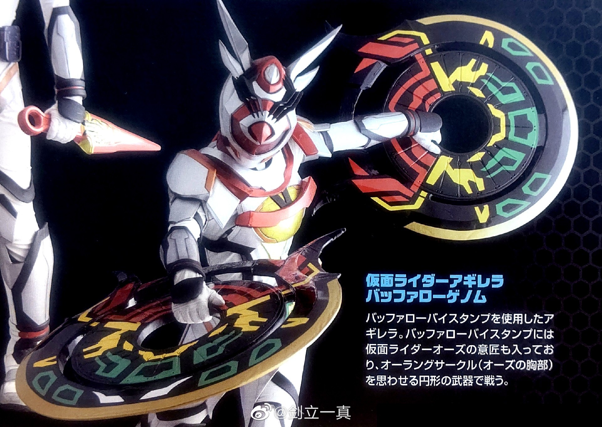 Aw that's cute, the Buffalo weapon is a repaint of the Kiwi Gekirin, that's another repainted Gaim weapon to add to Aguilerra's collection. The paint pattern is based on the OOO's chest emblem.