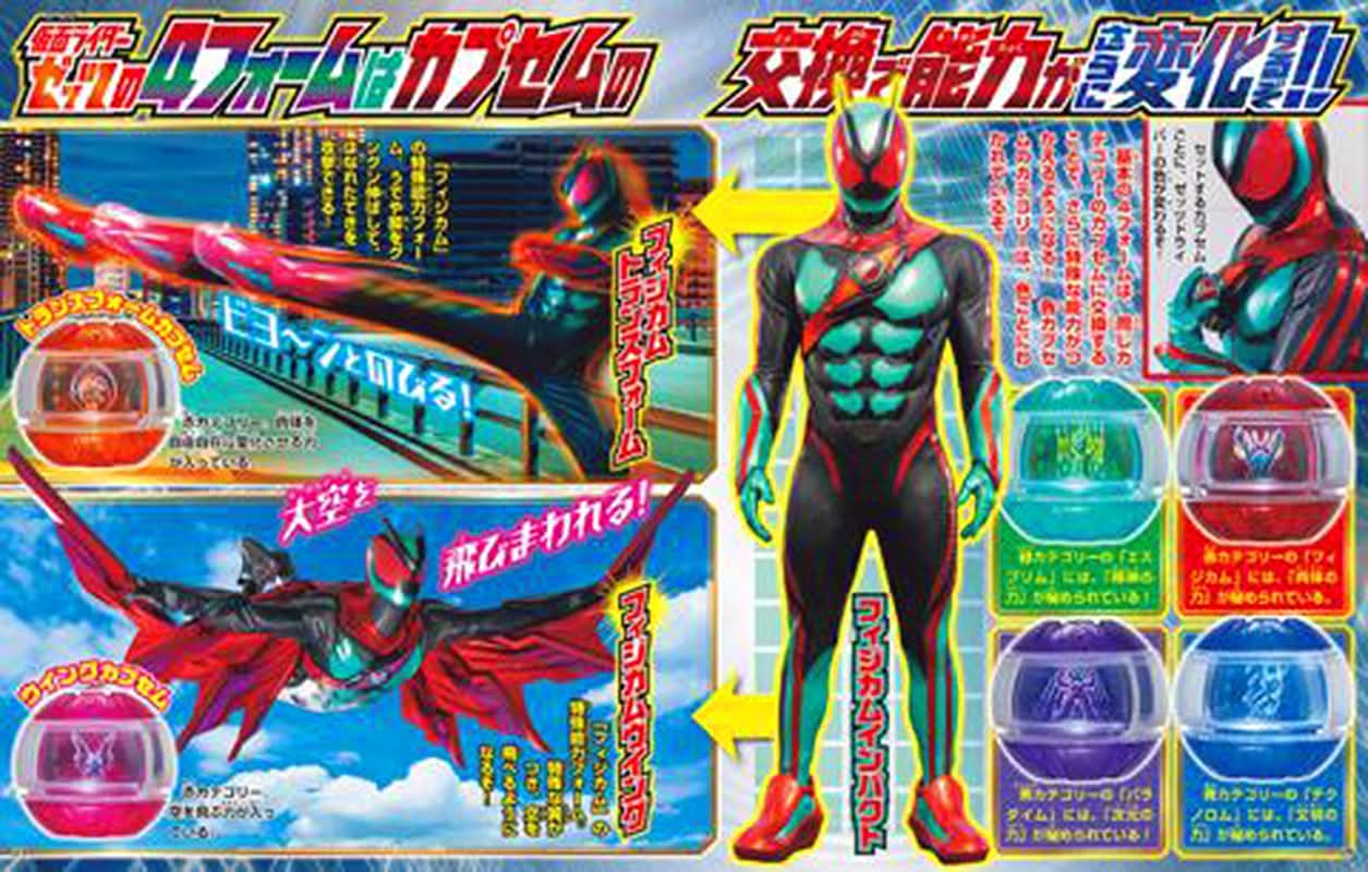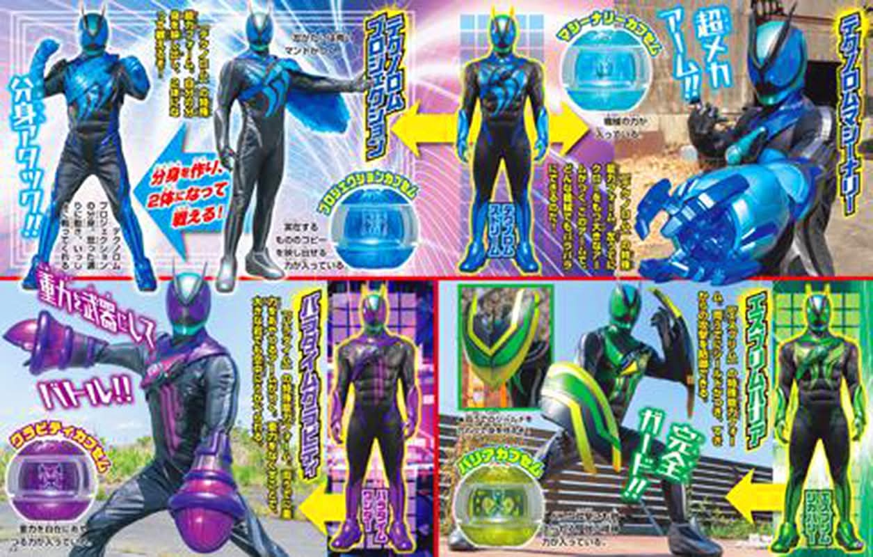 They're low quality, but I found some magazine scans! Looks like Zeztz has multiple gadgets, and I notice a few interesting details about the different forms. They each seem to use a different colored capsem, with ones in similar shades being related forms. Also, the ones with extra attachments have the boots, gloves and body lines grayed out, which makes me think the color represents some kind of power that gets concentrated into the attachments, maybe?