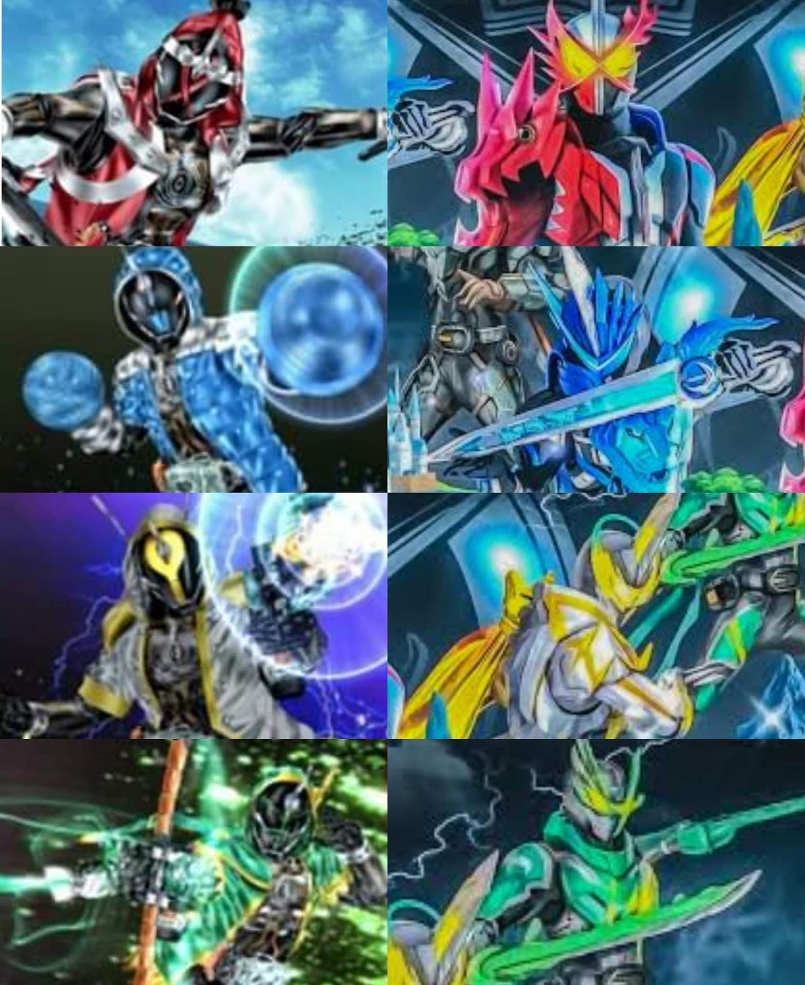 Kaenken Rekka > Kaen means flame, ken is sword, Rekka commonly translates to wildfire. Suiseiken Nagare > Suisei means water potential, ken is sword, and Nagare in this case means waterflow, typically the word nagare just means flow but in this case they used the characters for water and flow specifically, thus why it is waterflow. Raimeiken Ikazuchi > Because the mei in this case is the character for "cry(鳴)" and not "bright(明)" Raimei means thunderclap, ken means sword, and Ikazuchi means lightning. Fusouken Hayate > Fu is wind, souken means pair of swords/dual swords, and while Hayate commonly means gale, the Hayate in this case uses the kanji 翠風 instead of the common 疾風, making the translation green wind. The character 翠 is described to be a variant of the commonly known character for green 緑, usually a green hue with a slight bluish tint, and also depending on its usage can be used for the bird kingfisher.