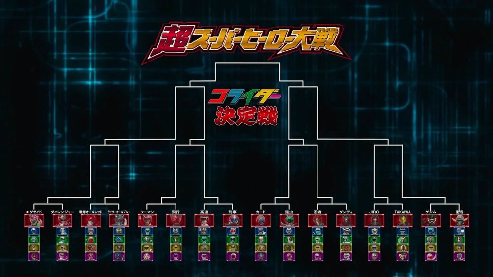 Rather than a full montage, we simply go through the majority of the tournament subplot with a tournament graphic. And rather than just make up a bunch of lineups, there’s some actual thought put into them. First up is Team Ex-Aid, which consists of a competitively balanced lineup, including Ex-Aid Robot Action Gamer (the melee fighter and the only way Ex-Aid can be considered a red hero), Shuriken Sentai Ninninger’s AoNinger (the magic knight), Zolda (the muscle), Tokumei Sentai Go-Busters’ Beet Buster (the brains) and Den-O (the guy itching for a fight). Next is Team Dairanger… which is just the lineup for the Sentai series of the same name (to quote my dad when he learned that someone in my class, when asked to create a short script featuring a detective, used Shaggy and Scooby-Doo as the detective and assistant, “No imagination”) Then it’s Team All Red Sentai, which is… exactly what the name implies. Consisting of Battle Fever J’s Battle Japan, Kagaku Sentai Dynaman’s DynaRed, Ninja Sentai Kakuranger’s Ninja Red, Mahou Sentai Magiranger’s MagiRed and Samurai Sentai Shinkenger’s Shinken Red. And for a thematic match up, we have Team All Blue Rider, which contains Den-O Rod Form, OOO Shauta Combo, Wizard Water Style, Diend and Gatack (the first three are kind of pushing it here). And now for the ones that don’t appear in person: First off is Team Woman, which consists of Electro-Wave Human Tackle, Ninpuu Sentai Hurricaneger’s HurricaneBlue, Bravo (yes, I know he’s not a woman, quiet you), Engine Sentai Go-Onger’s Go-On Yellow and Malika. They’re up against Team Hikō (flying), who consists of OOO Tajadol, Knight, Skyrider, Bakuryuu Sentai Abaranger’s AbareYellow and Kyoryu Sentai Zyuranger’s Ptera Ranger. For the next matchup, it’s Team Kosoku (high speed), consisting of Kosoku Sentai Turboranger’s Red Turbo, Drive Type Formula, Go-On Green, OOO Latoratah (the only one here who isn’t car themed) and Gekisou Sentai Carranger’s Pink Racer. They’re facing Team Keiji (detective), who comprise Accel, G3-X, Denshi Sentai Denziman’s DenziGreen, Tokusou Sentai Dekaranger’s DekaYellow and JAKQ Dengekitai’s Heart Queen. Up next is the rather more obvious Team Card, who comprise of Spade Ace, Tensou Sentai Goseiger’s Gosei Blue, Leangle, Odin and Decade. Their opponents are Team Konchu (Insects), who comprise of Wild Chalice (a mantis), KuwagaRaiger (a stag beetle), V3 (a dragonfly), TheBee (a wasp) and MagiPink (okay, she’s a fairy, but she looks like a butterfly) Then it’s Team Ninja, who boast ZX, Ninja Blue, Shurikenger, Hikari Sentai Maskman’s Yellow Mask and MomoNinger in their membership. They face off with Team Dandy, consisting of Hibiki, Skull, Zyuden Sentai Kyoryuger’s KyoryuBlue, Wolzard Fire and Signalman. And for a bit of a meta fight with the next matchup, we start with Team Jiro (a given name meaning “second son”), who feature Black, IXA, Shinken Gold, Seijuu Sentai Gingaman’s GingaBlue and GoseiKnight. And their opponent is Team Takaiwa (a surname meaning “high rock”), which should make the theming behind these two teams more clear, as it includes Faiz, Denji Sentai Megaranger’s Mega Blue, W, Fourze and Gaim. And for our final matchup, we start with Team Genm, who are literally the opposite of Ex-Aid’s lineup. They include Genm Zombie Gamer (Ex-Aid’s evil counterpart), Specter (a blue hero who debuted in 2015), Ryugen (a tertiary rider from a Rider Battle series who shares a Rider identity with someone else and isn’t what they first appear to be), Yellow Owl (who hails from an Inoue season to contrast Beet Buster being a Kobayashi season) and Momorenger (okay, there isn’t much in common between her and Momotaros besides the names). And the final lineup is Team Fukatasu (revival), who feature Kurokishi Hyuuga, Ressha Sentai ToQger’s ToQNigou, Kamen Rider Nigou, Riderman and Kamen Rider Mach. I’ll let someone else explain the significance behind the names and lineups, and instead ask “if this was an actual tournament, who would be your favourite to win?) |
