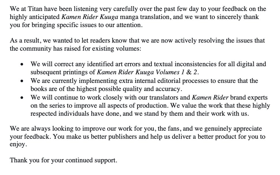 This whole situation with Titan has been really disappointing, between this and the absolute meme that is the Zero-One comic, the whole thing just feels so half-assed which at the point why even bother doing this in the first place if you weren't going to try. I'd love to see other Rider manga come to the west (Fuuto PI, Kamen Rider Spirits, OG Black) but hopefully someone other than Titan picks it up. |