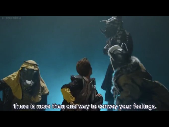 - I also went ahead and rewatched Gaburincho of Music because I will take any excuse to see that film. Calling it the best Sentai summer movie I've seen would be a huge understatement. It's a legit masterpiece in my eyes, capturing a ton of what makes Kyoryuger so good, especially in how expertly it tempers all the Sakamoto insanity with more quiet moments in just the right spots. Appropriately enough, the rhythm of it is commendable, and it tells a very tight little story while still putting the focus squarely on the action. Whether you've seen Kyoryuger or not, it comes highly recommended. - I'll also always remember Gaburincho of Music simply for being the one where Ucchi says "SHATTO GOHGURU de gozaru!", which I've always found to be utterly hilarious for some reason. I guess it's probably a Flashman reference in retrospect, but the awkward mix of English and old-timey Japanese is so definitively Ucchi that it's, well, perfect! (de gozaru.) - Oh my! Did I really spend so much time talking about other things in that post that I didn't get to mention how awesome Kyoryu Black is? Well, to make up for that mistake, I can at least share Ian's actor singing the best character song ever. (I still get goosebumps just thinking about the last time the show used this.) Quote:
