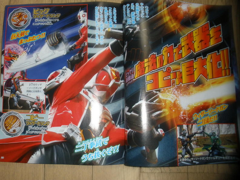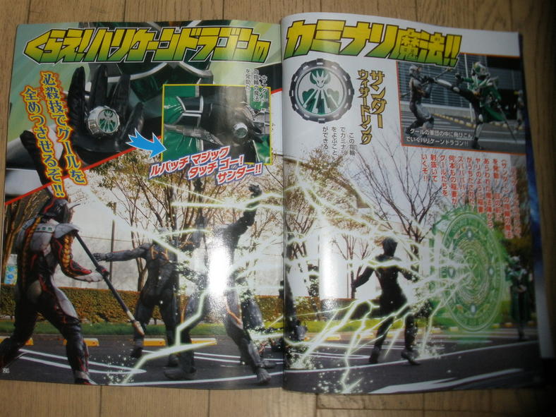 Following todays info on Gokaiger Vs. Go-Buster come magazine scans for upcoming Tokumei Sentai Go-Buster and Kamen Rider Wizard episodes! In todays scans, courtesy of Toku Insider, we get our first glimpse of Wizards' Hurricane Dragon Style and his special Thunder Ring. Also featured are a few pages noting all of Wizards' rings so far and their abilities as well as a few pages focusing on Movie Wars Ultimatum!
