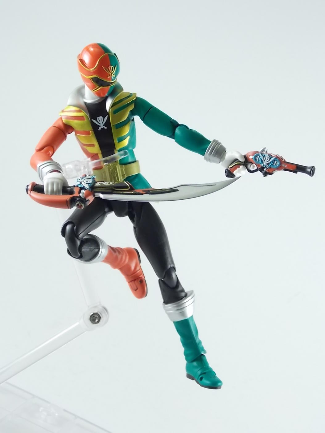 I still love how the helmet has both visor shapes on their respective color sides. Toei could've just used a red or green helmet that was specially colored and I don't think anyone would've batted an eye, but that little touch of detail makes the show version, and this version really nice I think.