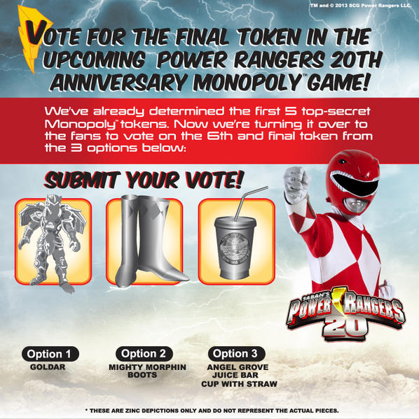 With the 20th Anniversary of Power Rangers upon us, its not surprising that this year will see more merchandise than ever before of the franchise. One of the more unusual pieces due for release is a Power Rangers Monopoly board game, and the Official Power Rangers Facebook Page is giving fans the opportunity to vote on the final token for it.