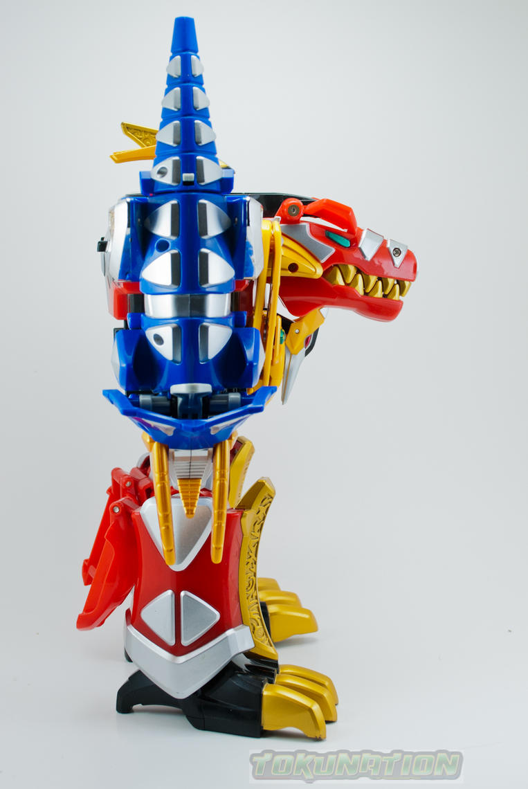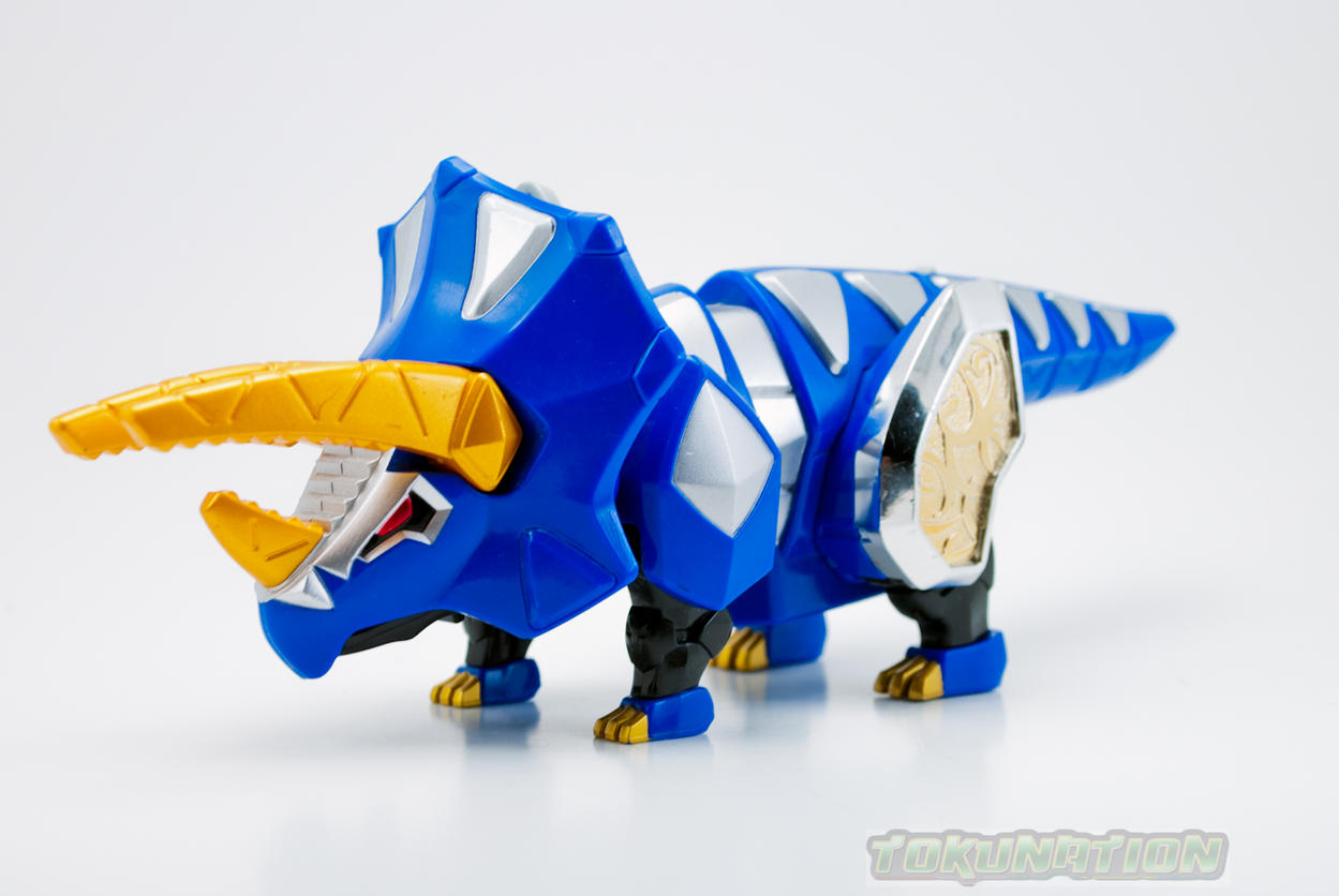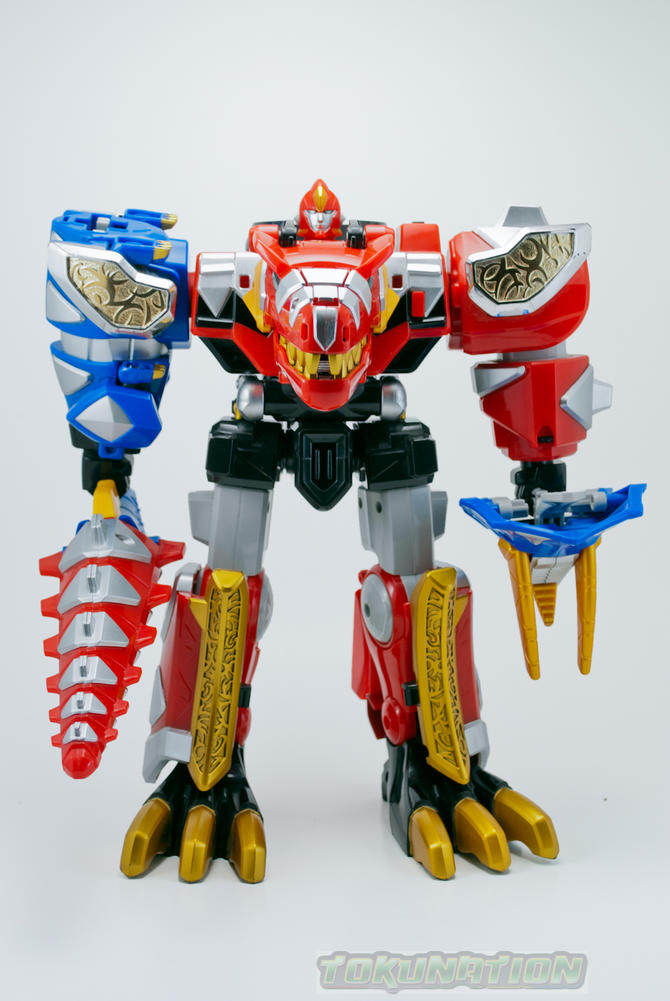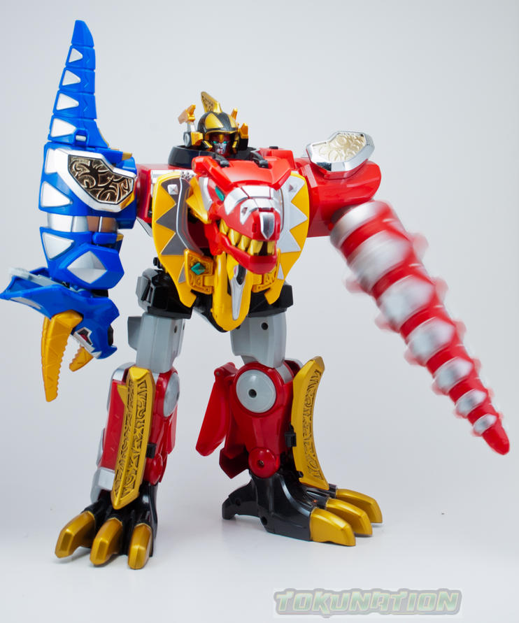 The Thundersaurus Megazord first appeared in episode two, Day of the Dino Part II, and is formed when the Tyrannozord, Tricerazord, and Pterazord combine. The Tricera and Tyranno zords can also come together to form the 'Thundersaurus Incomplete'. The Thundersaurus Megazord has access to several offensive attacks including the Tricera Fist, the Pterarang, and the Fire Breath, where flames shoot from the Tyranno zord's mouth. The Dx figure features 8 points of articulation and an electronic motor to replicate the Megazord's 'Tyranno Drill' finishing move. Enjoy the gallery! Want TokuNation.com updates on the go? "Like" us on Facebook and follow us @tokunation on Twitter!! Last edited by conundrum; 07-08-2013 at 08:59 PM.. |