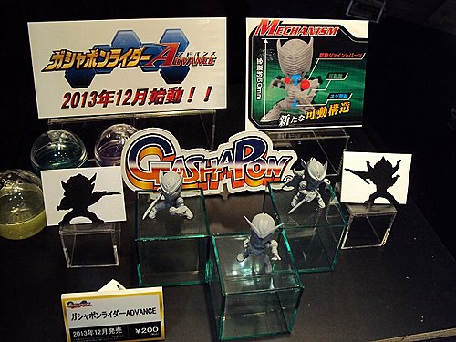 Kamen Rider Advance will be sold in Gashapon Machines, and the line will be starting off with Kamen Rider W, Ryuki, and Knight while Gaim and Baron are currently in development. The figures will be released December 2013 and will only cost 200 yen at the Gashapon machines. |