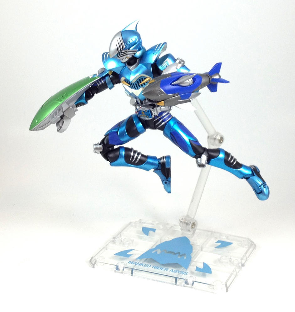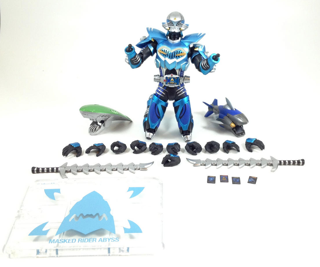Kamen Rider Abyss, is character that appeared on the Alternate Ryuki world in Decade, but then ended up being an Undead from the Alternate Blade world. Or something like that, I'd have to watch those episodes again to be sure. But what I am sure of, is that Abyss is an amazing figure. Coming in a Ryuki style box, and sporting the amazingly designed and amazingly executed Ryuki body, Figuarts Abyss is a figure you shouldn't miss. For accessories, Abyss includes: a stand (matching the style of the stands that have come with the Ryuki Figuarts) four Advent cards (Advent, Strike Vent, Sword Vent, and Final Vent; and again with the Ryuki ties) Abyss Saber (two wicked serrated swords) Abyssmash (the green shark head thing for Strike Vent) Abyss Visor (the blue shark thing) and a plethora of hands, 5 pairs and one extra right hand, to be exact (all repaints of Ryuki's, I believe). The paint on this figure is amazing! Though it shares the same body as the other Ryuki Figuarts, it has significantly more paint apps. The ribbed parts on the calves, hips, forearms and biceps are painted silver, which really makes Abyss stand out from the rest of the Ryukis. The lighter metallic blue is gorgeous, the dark blue adds great depth do it, and the white and silver highlights are really eye catching. Of course, each Ryuki Figuart has unique molded parts for the chest, back, shoulders and helmet, and Abyss' are quite neat, particularly the gold teeth on the shoulder armor, the overlapping scale-like bits on his back, and especially the helmet. I highly recommend everybody get this figure if you haven't already, it doesn't matter if you're not a fan of Decade, Blade or Ryuki, it's just a solid, fun, and expressive figure. Something about it makes me want to take silly pictures with it, so I have been. So, what do YOU think of SH Figuarts Abyss? I look forward to reading your comments! Want TokuNation.com updates on the go? "Like" us on Facebook and follow us @tokunation on Twitter!! |