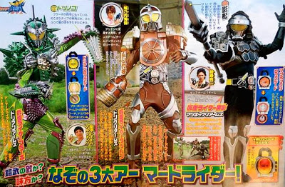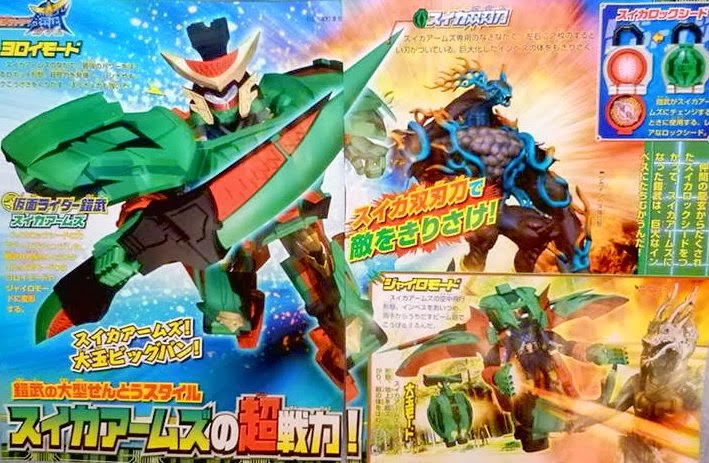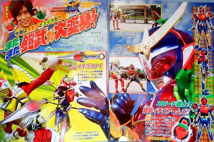 New magazine scans reveal a 7th Armored Rider, known as "Bravo!" Powered by the Durian LockSeed, this pointy newcomer has a lot to offer. The same scans also confirm the upcoming Riders, Gridon (who uses Acorn LockSeed, not Coconut as originally reported) and Kurokage (using Pinecone LockSeed). In addition this gives us a close look at two more of Gaim's Arm forms: *Strawberry Arms uses throwing knives called the "IchigoKunai" as its main weapon. *Watermelon Arms creates a gigantic suit of armor for Gaim and gives him the ability to fly. Things are looking very good for the future of the 15th Hesei Rider series right now! ![]() SOURCE: JEFUSION Last edited by ZeoRangerV; 10-28-2013 at 07:38 AM.. |