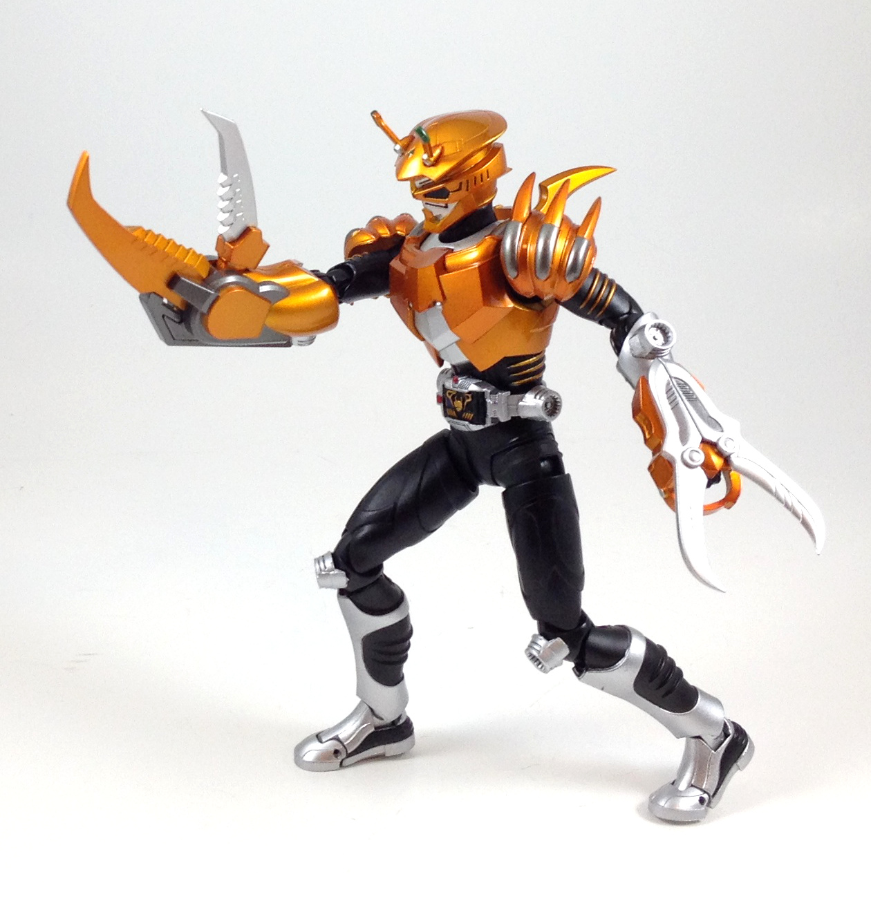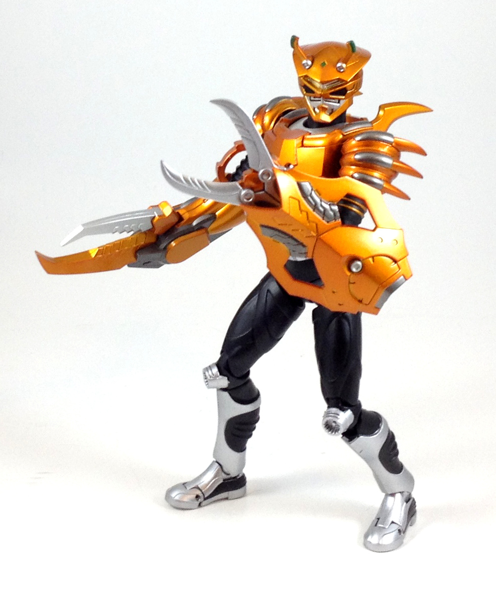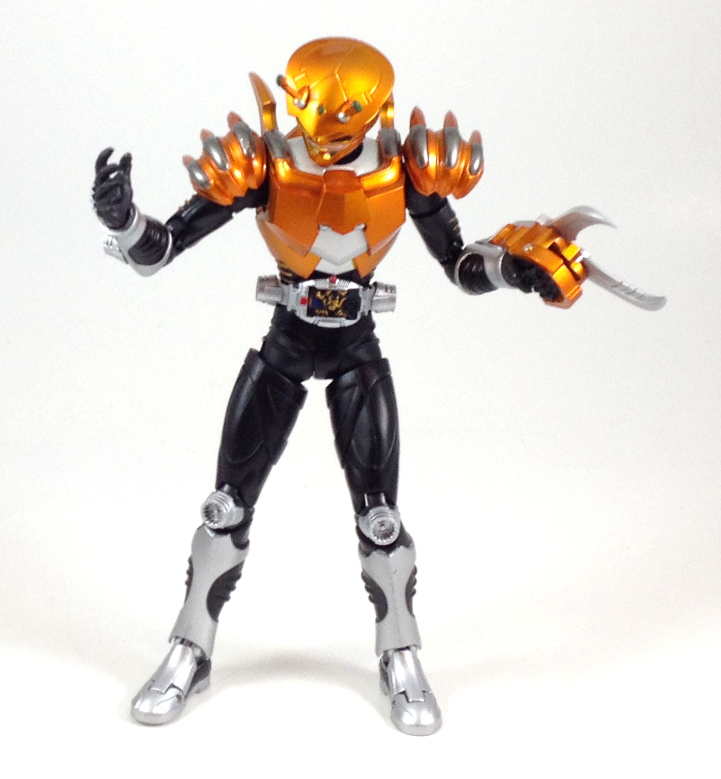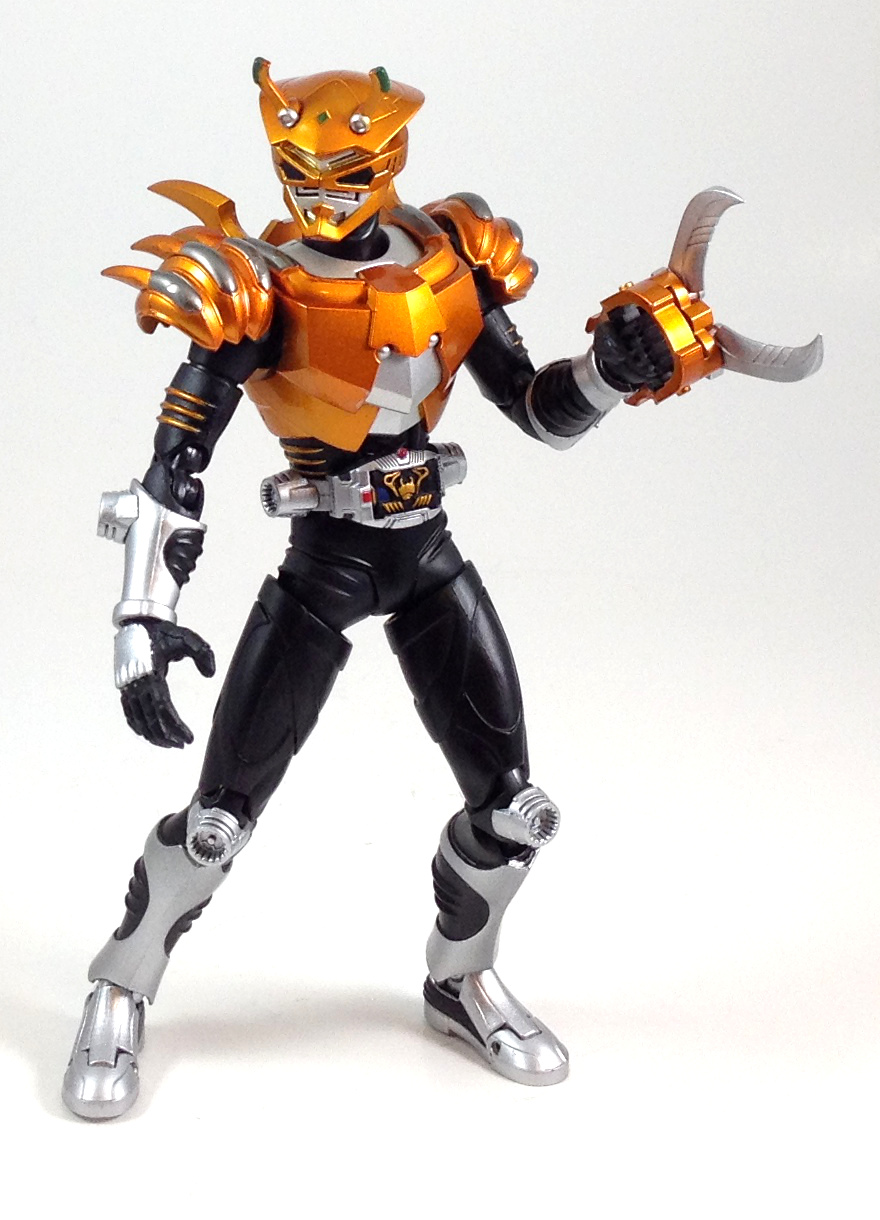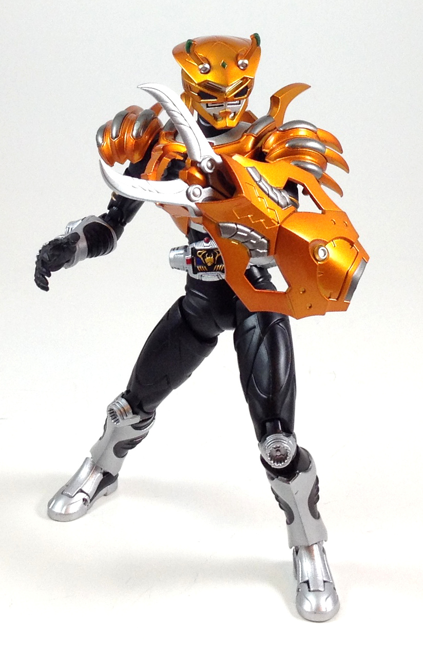 I really like this figure. The bronze orange armor really makes him stand out on the Ryuki shelf but its the head sculpt that does it for me. A crab themed Rider is not usually something that's going to put you on guard but the weapon this guy comes with is sure to make his opponents feel otherwise. The stand and the broken deck were excellent touches. Not sure if I'd want the Ride Beast for this guy though.