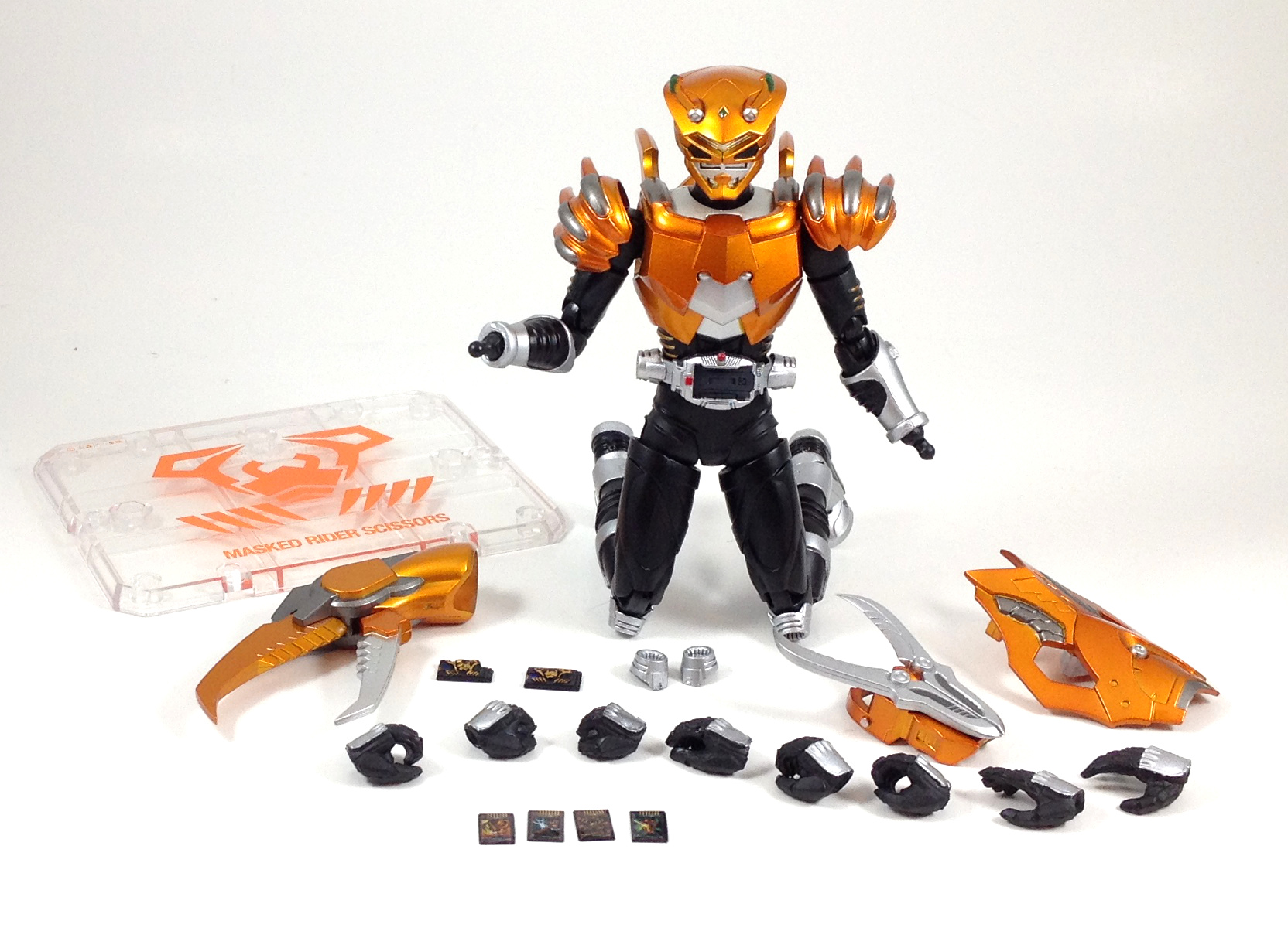 Scissors comes with a nice selection of accessories, a personalized Tamashii stage, four Advent Cards, his Visor, his Strike and Guard Vents, a bunch of hands and two card decks, one of which is shattered. Want TokuNation.com updates on the go? "Like" us on Facebook and follow us @tokunation on Twitter!! |