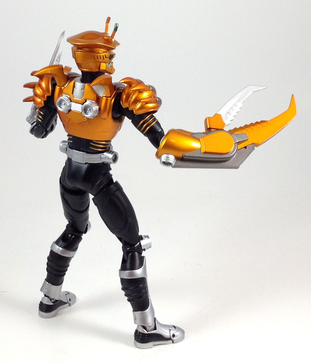 As with the other Ryuki Riders, Scissors shares everything from the torso down, and the arms from the biceps to the hands. Like the others, he features unique mask, shoulder armor, chest and back pieces, and as always, the distinct creature theme and coloring is different enough to make him stand apart from his fellows.