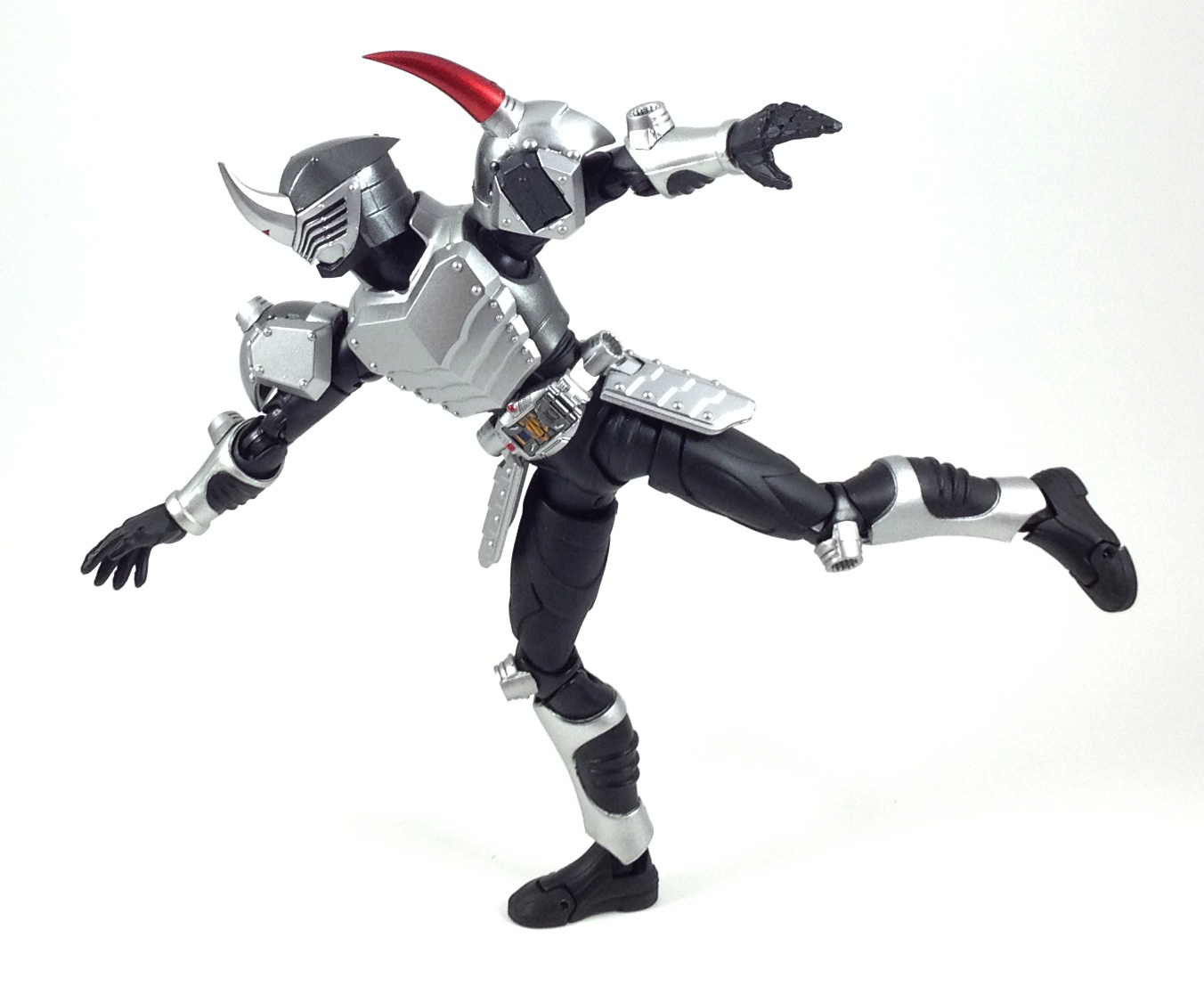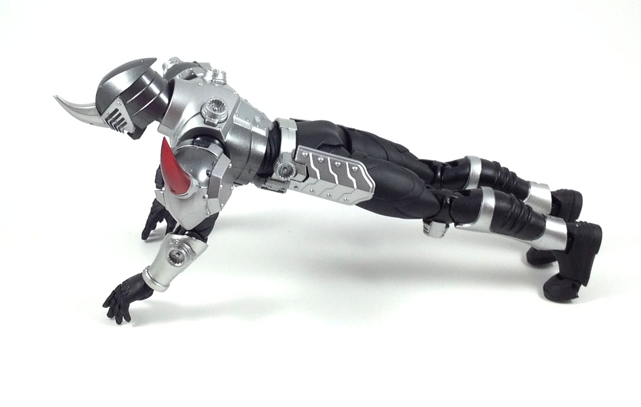 But, he's a beautiful figure (yes, I have said this about every figure in the line, and I will continue to do so), and if you're a crazy person like me, I mean, a completist like me, then you need him. Gai's armor is very much meant to invoke a knight in armor of old, it's sculpted with many overlapping plates, and the silver and gunmetal gray metallic paint finish off that look. He's sorta bland by himself, in a monochromatic way, but on a shelf with the other, many colored, Ryuki Figuarts, he stands out in his own way. As for accessories, Gai has a lot of hands, and his Strike Vent. And that's it. Granted, he didn't use anything else in the show, but that he doesn't even include a Tamashii stage to soften the blow of his high price, or effect parts or anything. The value is just not there with this guy. I do like the design, especially the red horn on his left shoulder, and of course the execution of the figure itself is good, but the extreme rarity of the figure, the severe lack of accessories to lessen the impact of the high price on the secondary market make Figuarts Kamen Rider Gai and extremely skippable figure. Even at the relatively low price I paid for him ($85), I don't recommend him to anyone but hardcore Ryuki fans, or completists. |