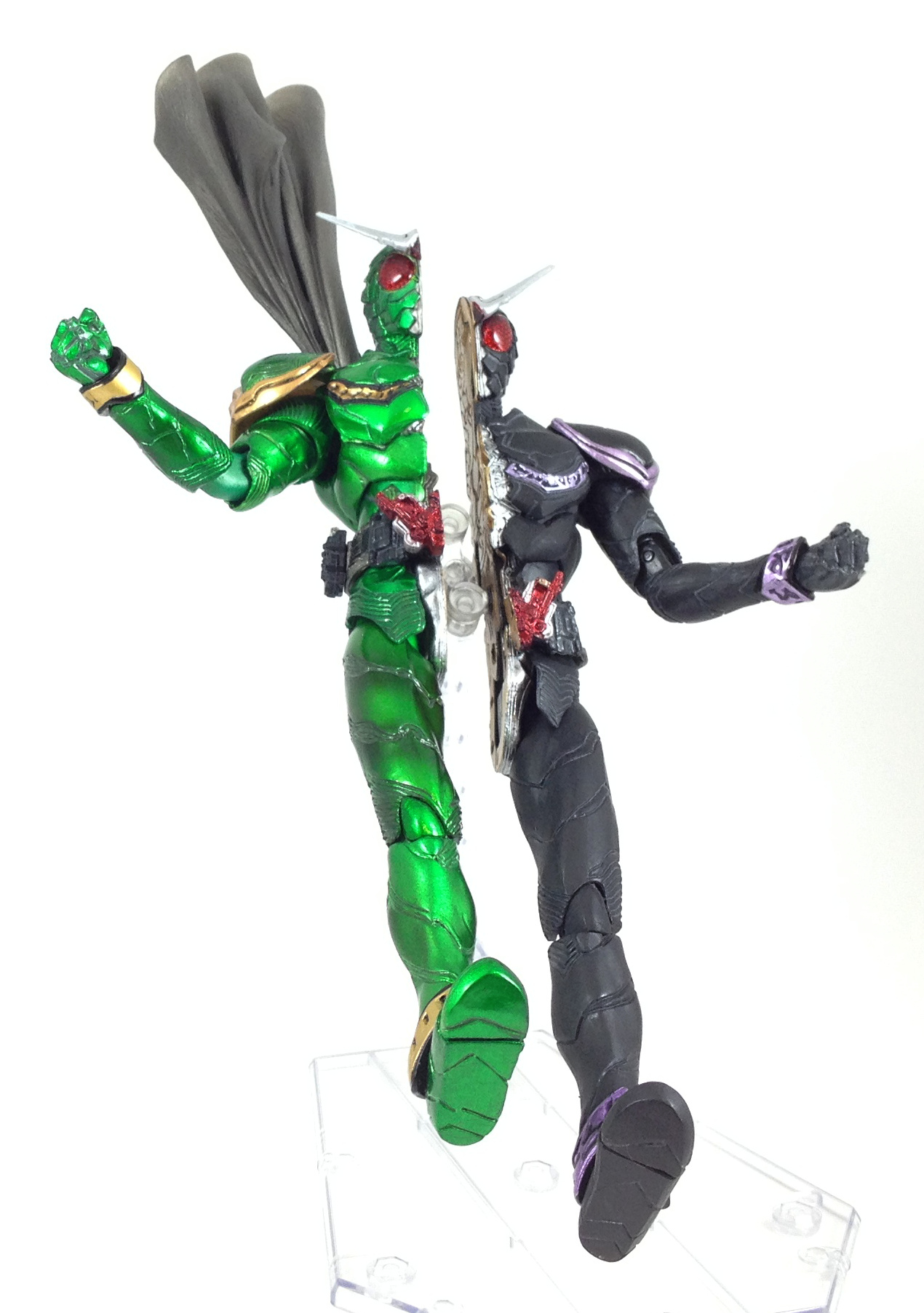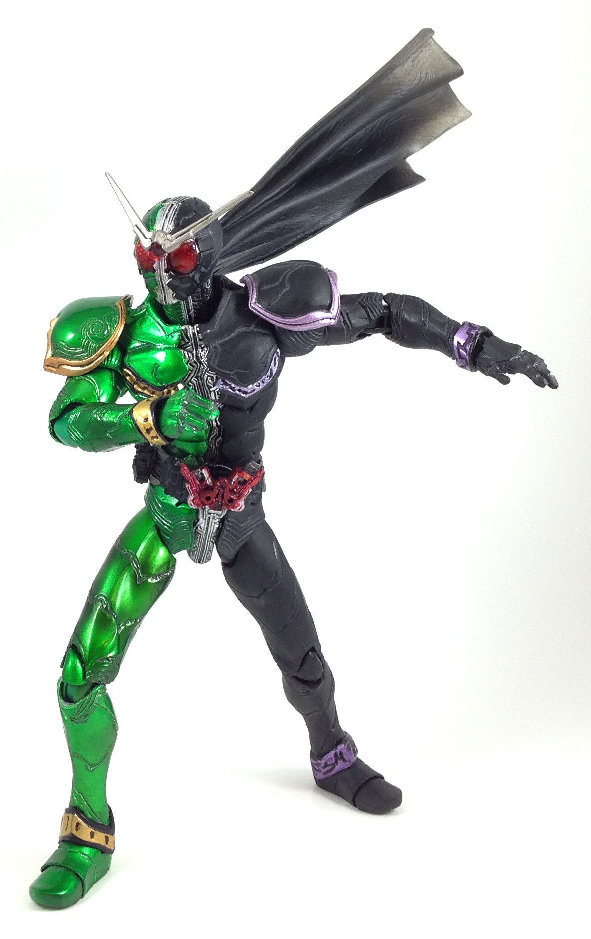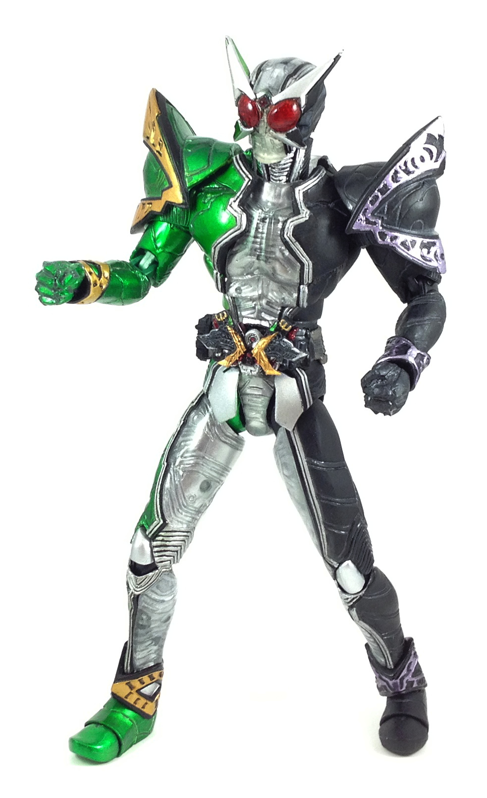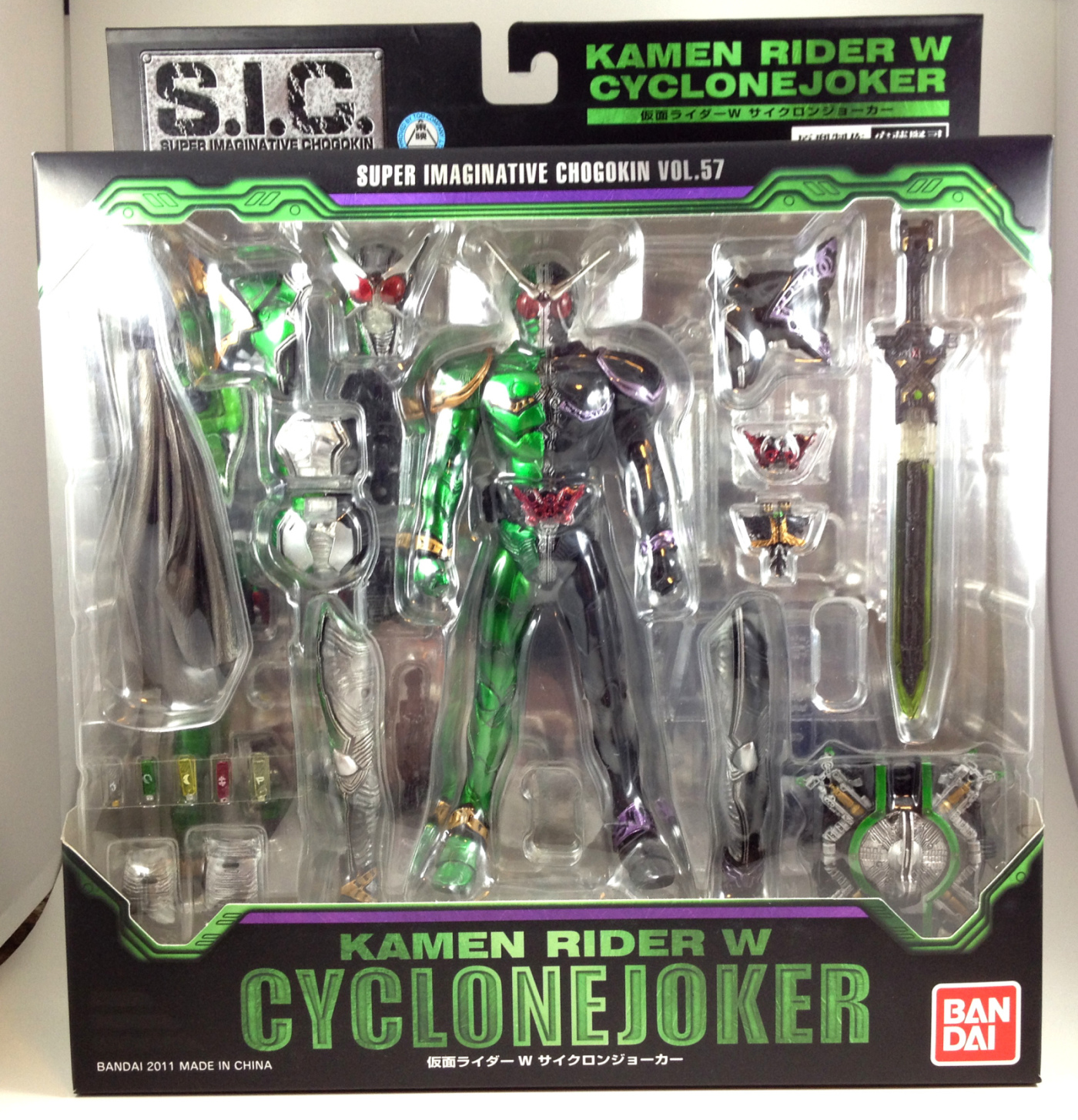 The first of the SIC figures from Kamen Rider W, CycloneJoker includes a plethora of plastic pieces, nearly ever possible thing you could ever need for the CycloneJoker form, as well pieces to transform W to his upgraded CycloneJoker Extreme form. There's too many accessories to list them all out, but the highlights include 5 tiny regular Gaia Memories, the Etreme Memory, the Prism Bicker, two Double Drivers, an articulated scarf, a Tamashii Stage Act 5, several swapable hands, and various swapable parts to implement the form change.