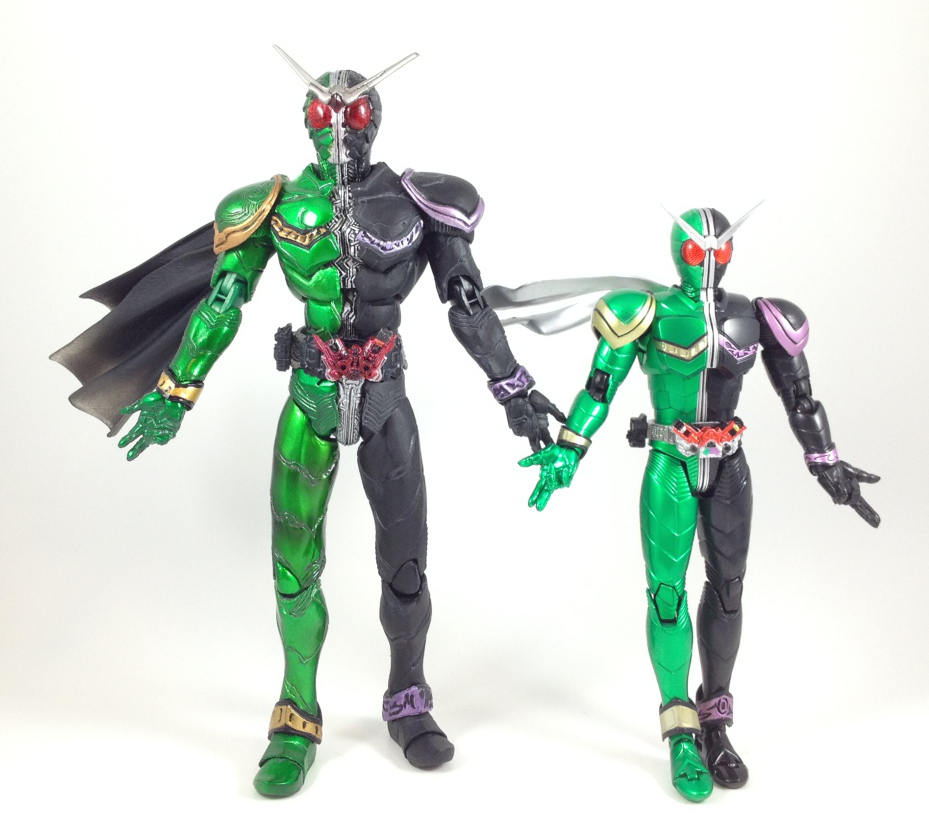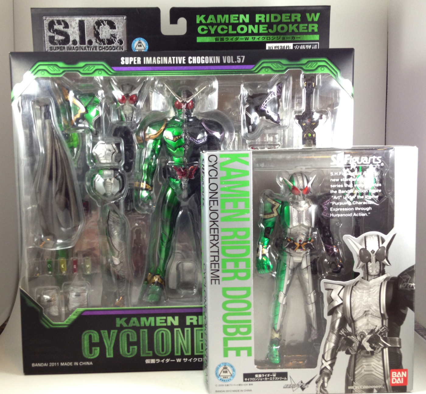 I hope this means we'll see galleries of them all, just so more people can see what wonderful figures these are. ... The CycloneCyclone JokerJoker Tamashii set features the full form-swappability introduced with HeatMetal and LunaTrigger. So if you have no inclination to own two forms that lasted seconds in a movie, that set is excellent as you essentially get an upgraded CycloneJoker, and it frees up the original's skeleton for CJX to be displayed alongside rather than having to choose which one, which is the only major drawback of this set none of the others share. It really is a testament to this set that, despite easily being the weakest in terms of value and options... it's still a tremendous set in terms of value and options. It really dissapoints me that the OOO SICs are so slow to release and there's no Forze SIC's. The line is so good at integrating collector-quality figures and complete gimmickry. I was thinking that someday I would get the CC/JJ set, so I can display CJX and have whichever 3 of the other 9 forms I want, but I've lately been thinking of selling these, because I need money, because I need the space, and because I didn't think I liked them as much as I first thought. But playing with it for this review, seeing all the neat accessories, makes me want to keep them again. And get CC/JJ. Last edited by ryan; 12-16-2013 at 12:59 PM.. |