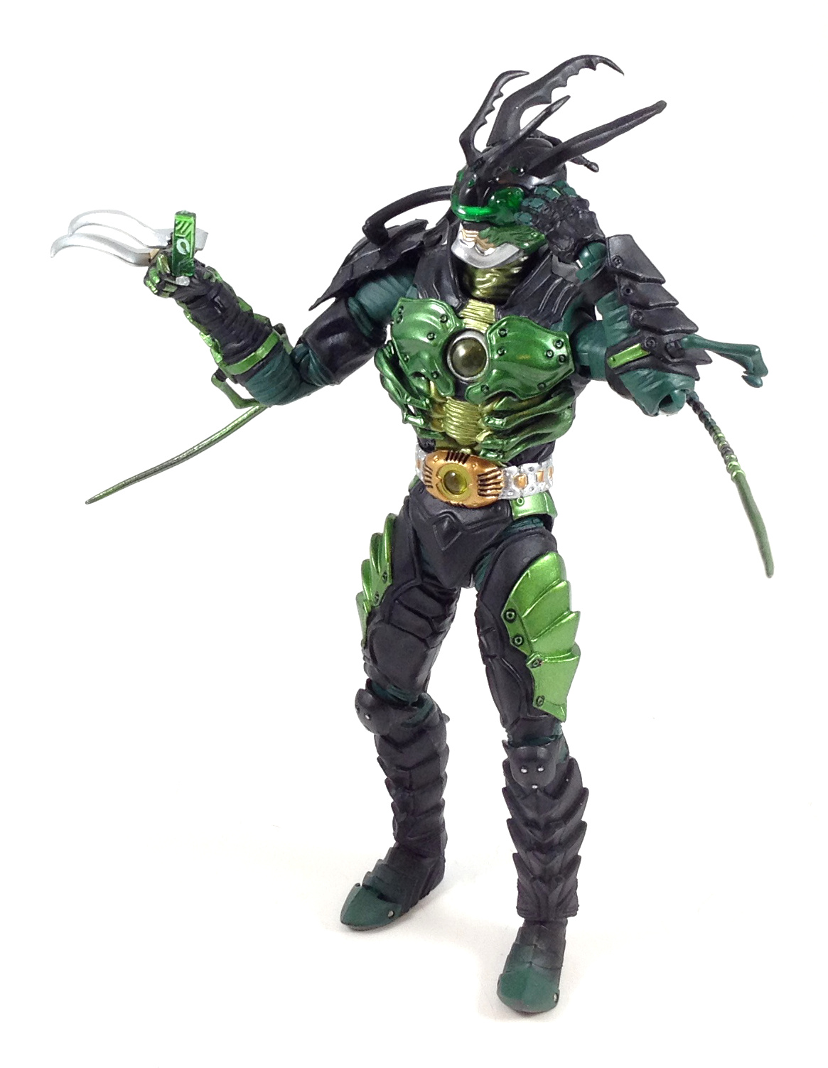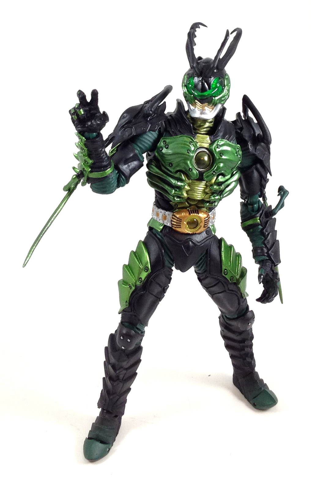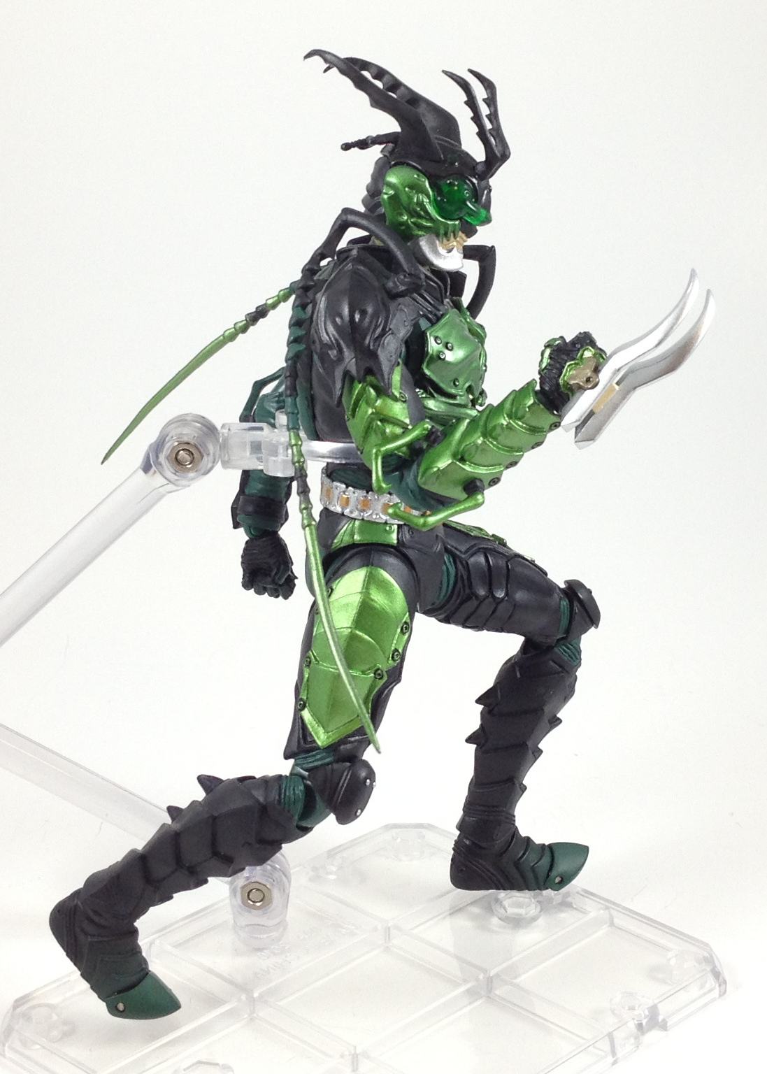 Like all of the Greeed Figuarts, Uva is fantastically detailed, has excellent paint, and great articulation. Unfortunately, the hip joints on mine are a bit more loose than I would like, but I expect that's a problem specific to mine, and not widespread. Like the previously reviewed Kazari Uva's eyes/nose(?) are made out of transparent plastic, though Uva's doesn't catch the light as well as Kazari's. Uva's suit also isn't covered by quite as many tiny detailed spots, so while the paint is great, his is more impressive in the sculpting. Uva is covered in overlapping plates, it really adds to the insectoid look of the character. Uva also has a bunch of grasshopper-like bits hanging off his shoulders, forearms, and head. And the chest armor is hideously sculpted, looking very buglike. He's the creepiest looking of the Greeed, in my opinion, but then, insects rather give me the creeps, so... For accessories, Uva comes with pretty much the same thing as Kazari, a Tamashii Stage Act 4, two piles of medals to plug into the stage, and a few alternative hands. Not a lot of accessories, which made me feel the price I paid was a bit unwarranted. Uva has two left hands, a fist and a sorta calm open hand, and four right hands, first, calm open hand, a three-fingered sorta grasping hand, and one that looks like it could hold a O-Medal between the thumb and forefinger, if I had any individual Medals I would have tried it. The right hands have a plug in them for the two-pronged blade he has, which plugs in very tightly and was kind of a pain to take off when I wanted to swap hands. Uva isn't my favorite of the Greeed, but he's a well executed figure, looks great with the rest of the Greeed, and is worth picking up. |