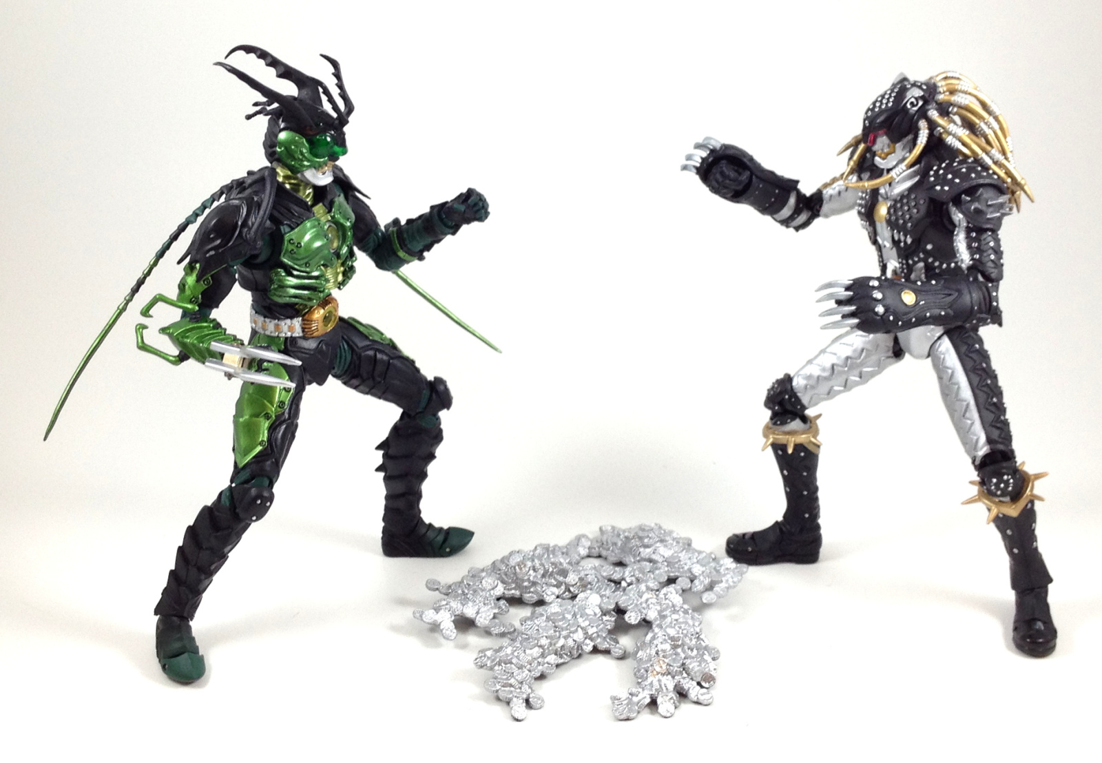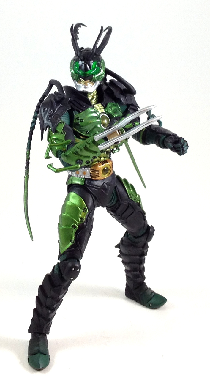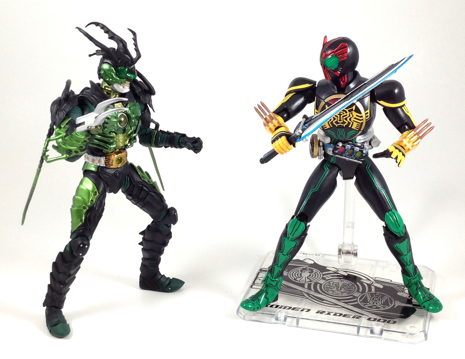 Like all of the Greeed Figuarts, Uva is fantastically detailed, has excellent paint, and great articulation. Unfortunately, the hip joints on mine are a bit more loose than I would like, but I expect that's a problem specific to mine, and not widespread. Like the previously reviewed Kazari Uva's eyes/nose(?) are made out of transparent plastic, though Uva's doesn't catch the light as well as Kazari's. Uva's suit also isn't covered by quite as many tiny detailed spots, so while the paint is great, his is more impressive in the sculpting. Uva is covered in overlapping plates, it really adds to the insectoid look of the character. Uva also has a bunch of grasshopper-like bits hanging off his shoulders, forearms, and head. And the chest armor is hideously sculpted, looking very buglike. He's the creepiest looking of the Greeed, in my opinion, but then, insects rather give me the creeps, so... For accessories, Uva comes with pretty much the same thing as Kazari, a Tamashii Stage Act 4, two piles of medals to plug into the stage, and a few alternative hands. Not a lot of accessories, which made me feel the price I paid was a bit unwarranted. Uva has two left hands, a fist and a sorta calm open hand, and four right hands, first, calm open hand, a three-fingered sorta grasping hand, and one that looks like it could hold a O-Medal between the thumb and forefinger, if I had any individual Medals I would have tried it. The right hands have a plug in them for the two-pronged blade he has, which plugs in very tightly and was kind of a pain to take off when I wanted to swap hands. Uva isn't my favorite of the Greeed, but he's a well executed figure, looks great with the rest of the Greeed, and is worth picking up. |