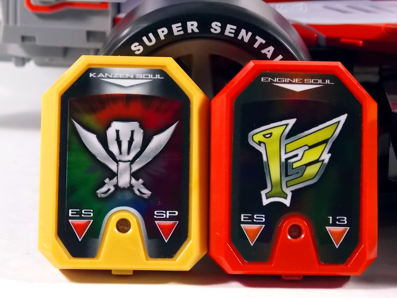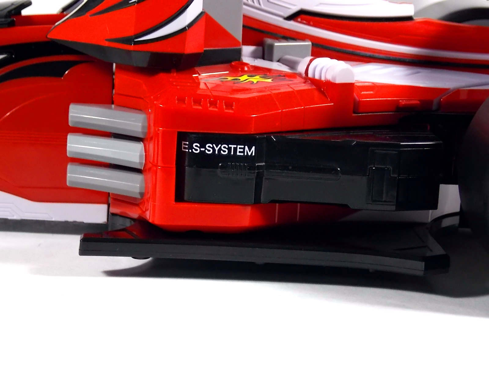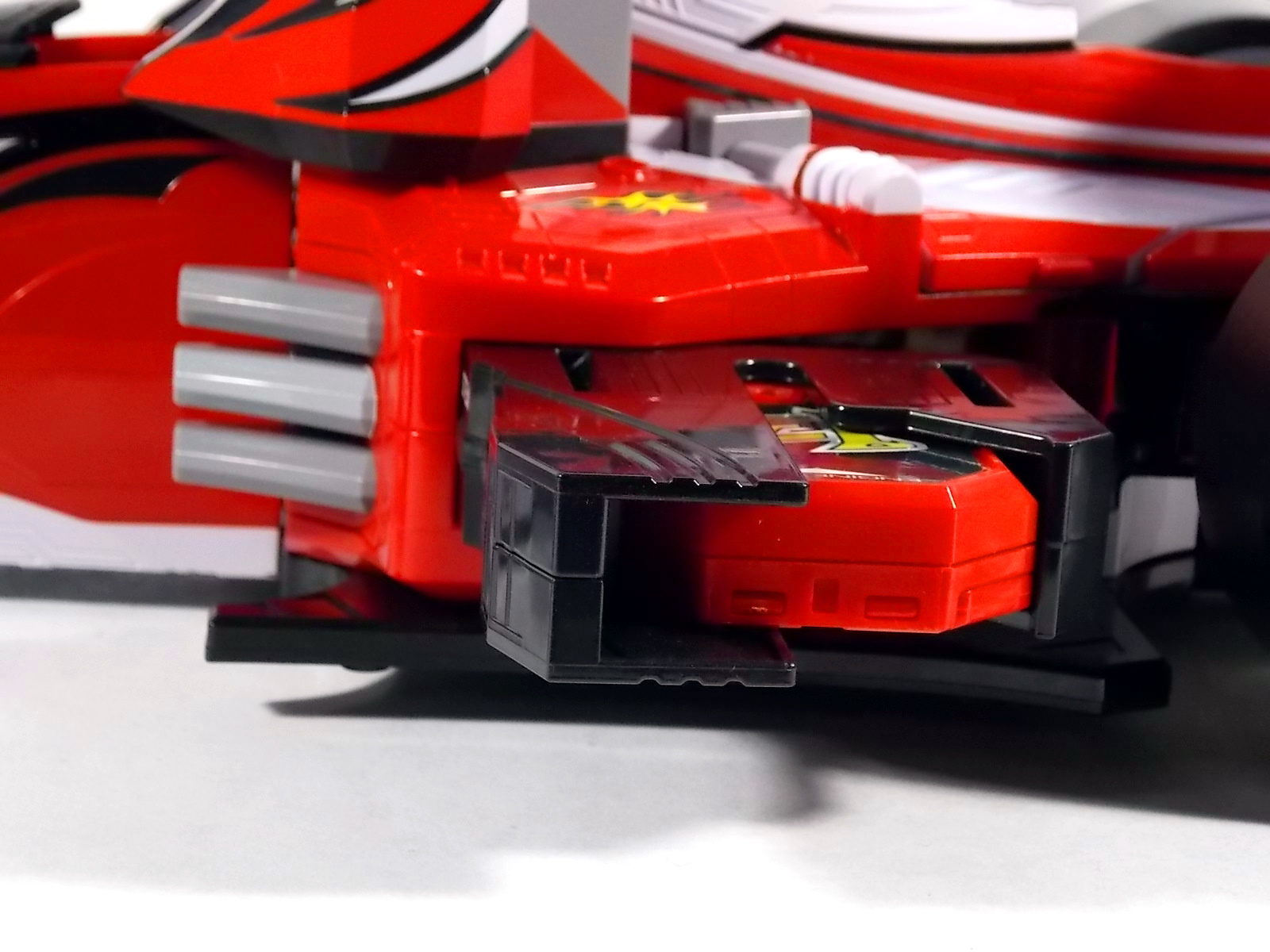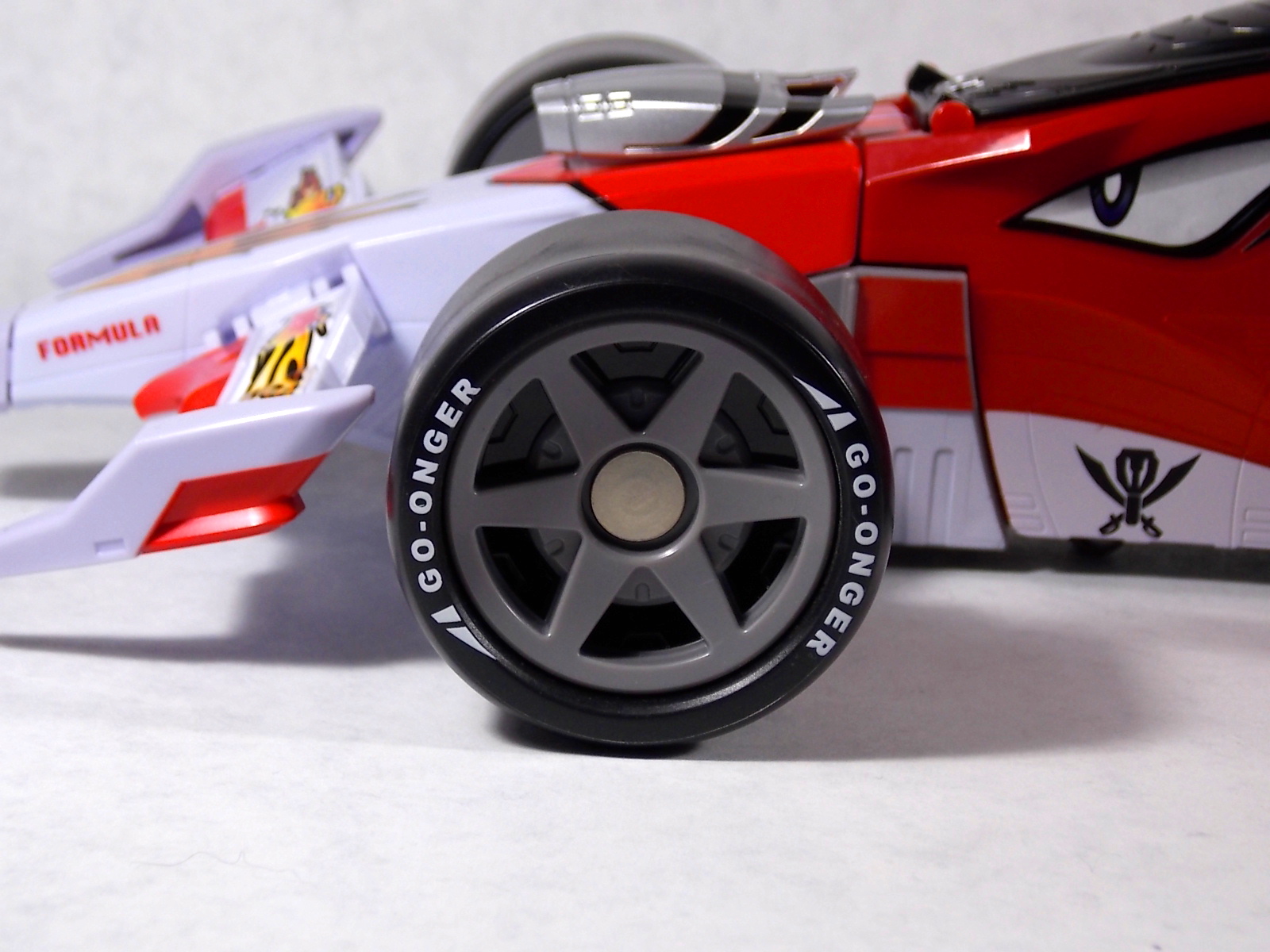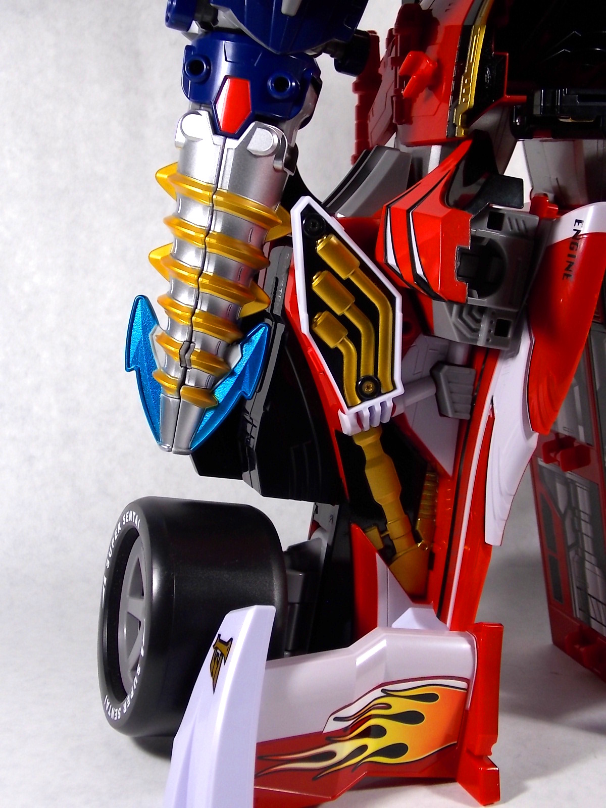 Our final gallery from Kaizoku Sentai Gokaiger is here! The 5th and final Gokai Machine, DX Engine Machalcon! Machalcon is of course a tribute to Engine Sentai Go-Onger. But it's much more special than that. In Go-Onger there were 12 main engines that made up the 4 central mecha. Machalcon isn't just an homage to them, but is the 13th Engine! As the son of Speedor & BeaRV he's inherited their fiery spirits and sentai legacy! As such the figure features the Go-Onger names on it's front tires and Super Sentai is emblazed on the rear tires. And as a proper Engine, Machalcon incorporates the Engine Soul gimmick. However he's unique in that he can take TWO Souls. On either side of his vehicle mode there's a slot for an Engine Soul. The standard #13 soul to "awaken" Machalcon & trigger his growth in show, and another slot for the Kanzen Soul which allows for combination with Gokai Oh! But wait, the gimmicks don't stop there! Machalcon also features a cockpit which can accept Ranger Keys! Included with Machalcon is the Go-On Gold Ranger Key. However the sound effect it triggers in a DX Mobirate is actually that of the Go-On Wings Key, which is the key originally solicited to come with Machalcon. A very odd case indeed. But any Ranger Key at all can ride in Machalcon. Where this beast truly shines is in combinations. Now much like Gao Lion before him, Machalcon features a very centaur like combo with Gokai Oh. "When pirate and Engine Souls become one,with an Engine's roar the hearty king is born, Go-On Gokai Oh!" This combo sees the upper torso and arms of Gokai Oh connected just behind the cockpit of Machalcon. Practically as a toy it may not look perfect because in show this thing was crazy mobile. But it's very imposing. To help replicate this forms ability to fly in show, all the tires are capable of folding down, though obviously it still sits on the ground as a toy. And the biggest baddest combo of all. Kanzen Gokai Oh! This form requires all of Machalcon, but only the most basic piece of Gokai Oh (the hollow & helmetless torso) and Gojyujin (the arms) but the end result is magnificent. A truly beastly combination that looks just as impressive as it does in show. What really sets it off is the massive emblazoned chest crest and the magnificent sword helmet. As you can see it's big, chunky, and tall, and worth every bit of the price. Machalcon can be readily found in the 4000-6000 yen range and is very much worth it on it's own. The combination is icing on the cake.