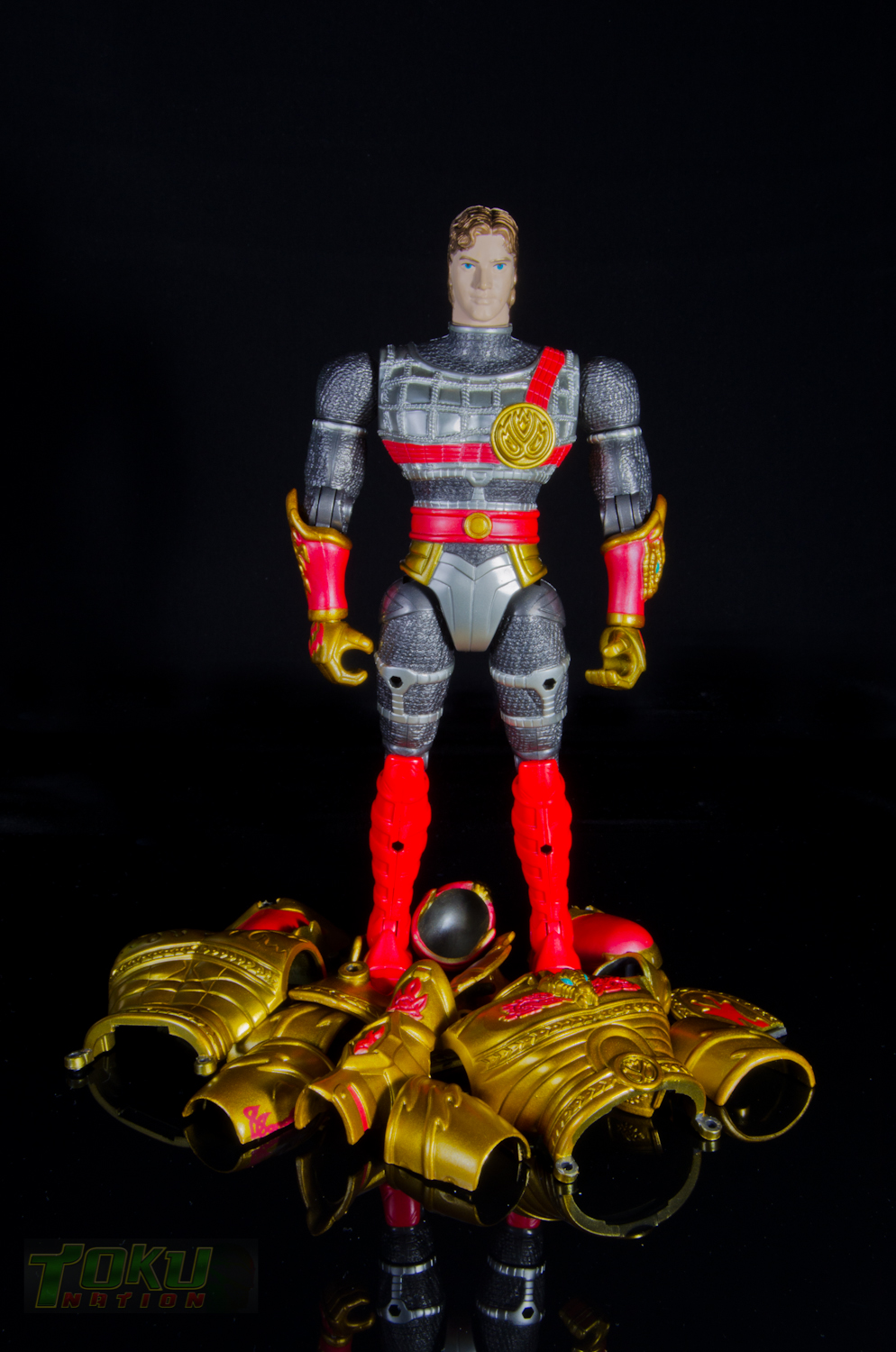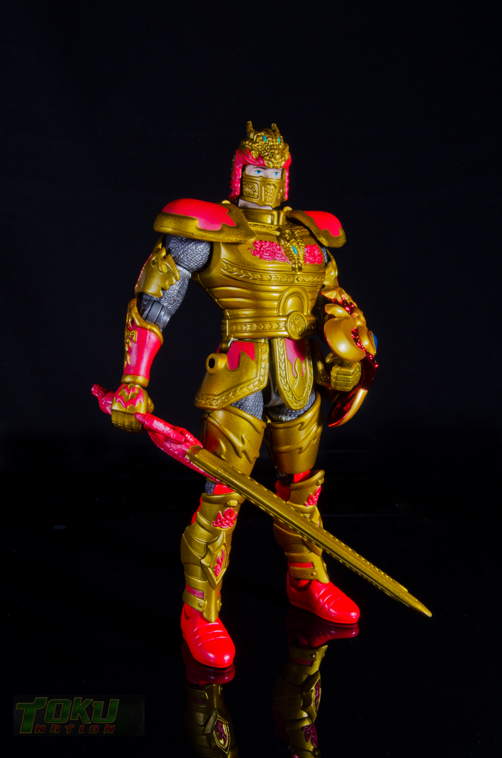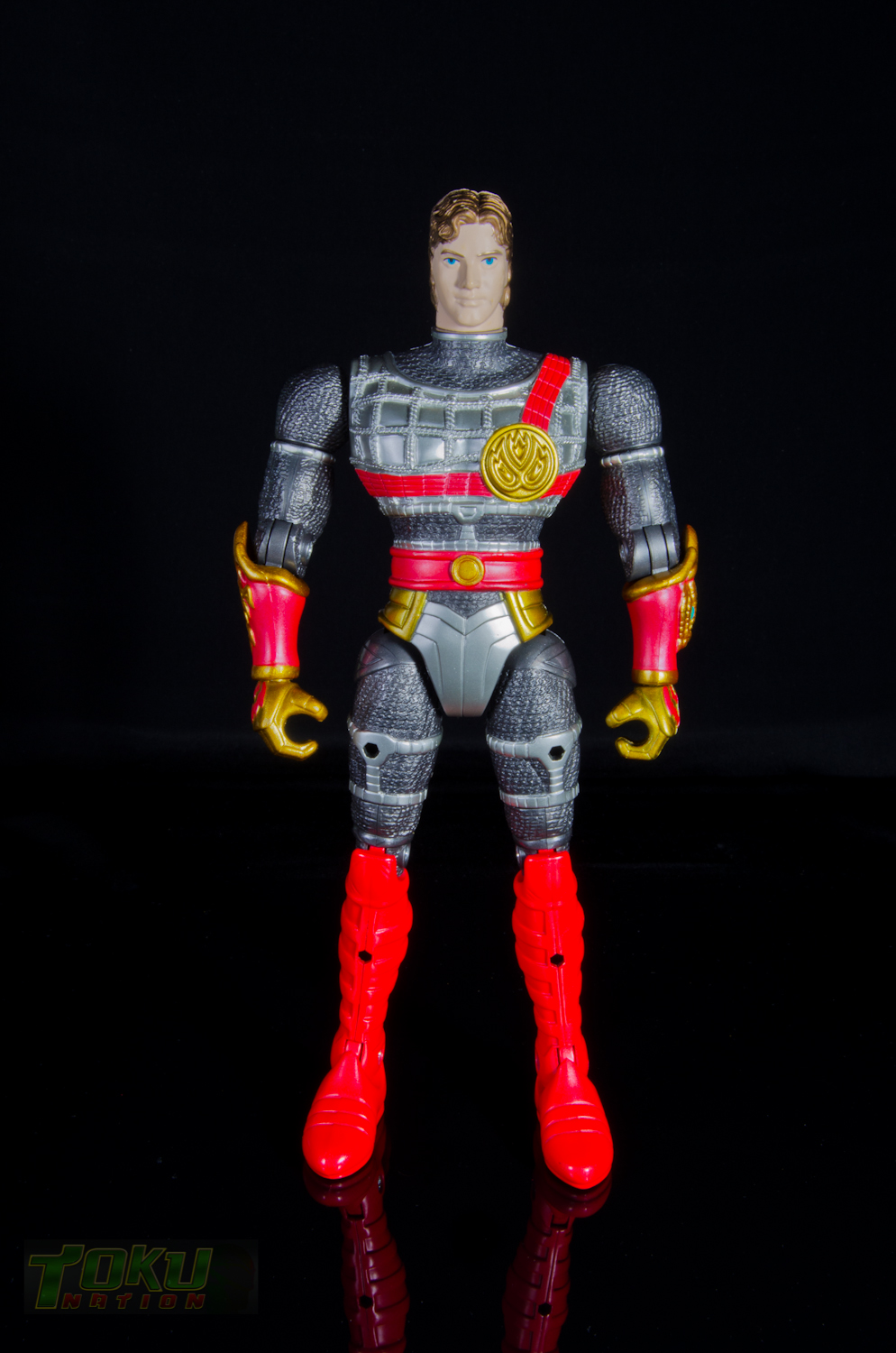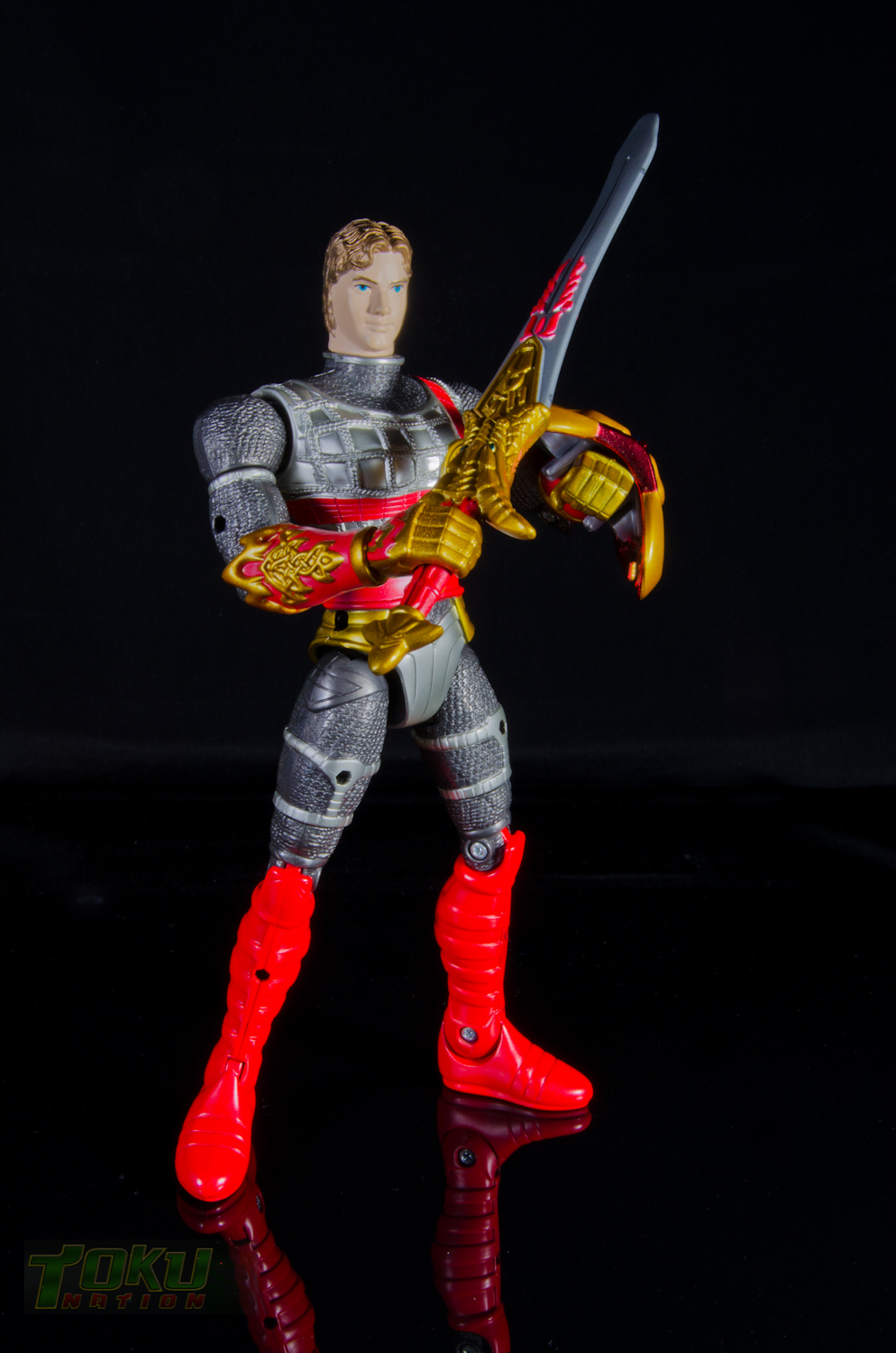We're back with another gallery featuring Bandai of America's 1998 Mystic Knights of Tir Na Nog line and this time we're taking a look at the 8 inch Rohan, Mystic Knight of Fire. Simply put, everything that the 5 inch Mystic Knights do (you can check out the gallery of 5" Rohan here) the 8 inch figures do better. Rohan features 21 points of articulation, has 18 pieces of removable armor, and comes with The Sword of Kells, a smaller sword, an axe, a Dragon's Breath Dagger, dagger sheath, and a shield. Unlike the 5 inch version, this larger Rohan's shield cannot clip into DX Pyre's chest. Somehow, the designer's managed to accurately capture all of the gorgeous designs and details of the on-screen armor in this figure. Due to the way the chest armor and skirt pieces connect together, the hip/thigh articulation of the figure is not hindered that much. All of the armor pieces attach very securely to the figure and although there are some noticable seams, it holds together well. I would easily recommend the 8 inch versions of the Mystic Knights over their 5 inch counterparts, however, there are two drawbacks. First, it's extremely difficult to find one loose, complete, and for a reasonable price on the secondary market. Secondly, only Rohan, Angus, and Ivar were made in the 8 inch scale, leaving completionists pining for an in-scale Deidre. In the end though, the 8 inch Rohan is the best representation of the Knight of Fire that you can get and I highly recommend it to fans of Mystic Knights of Tir Na Nog, the suits, or just American Toku in general. |