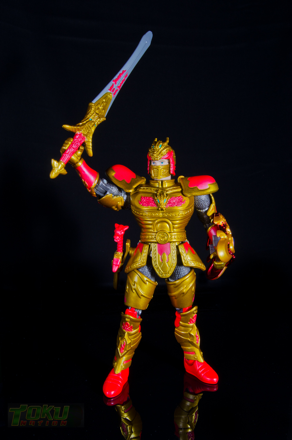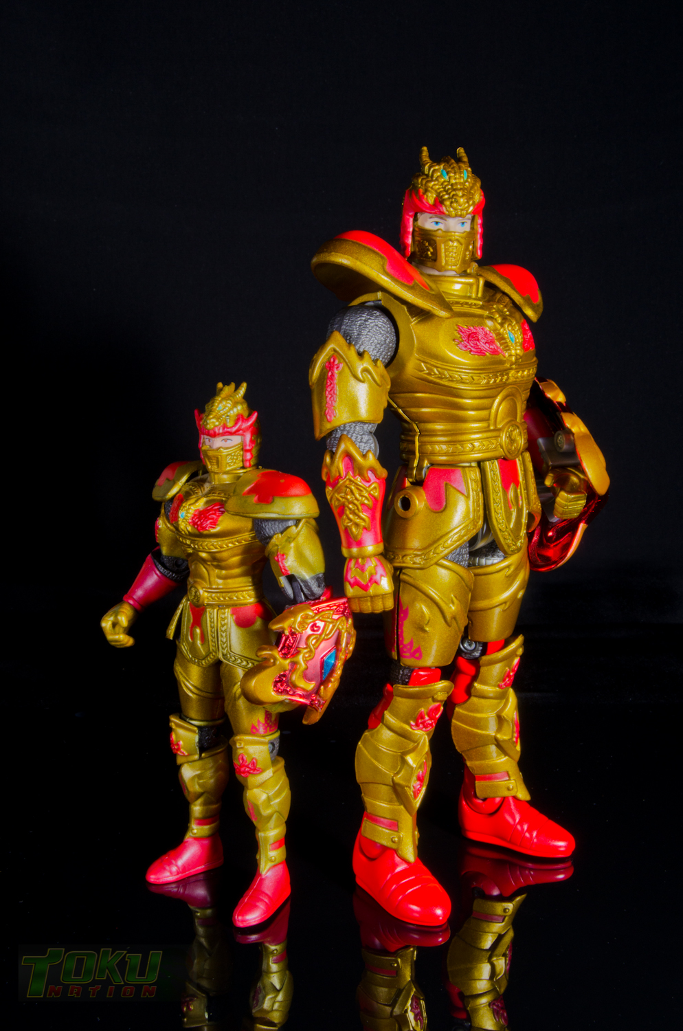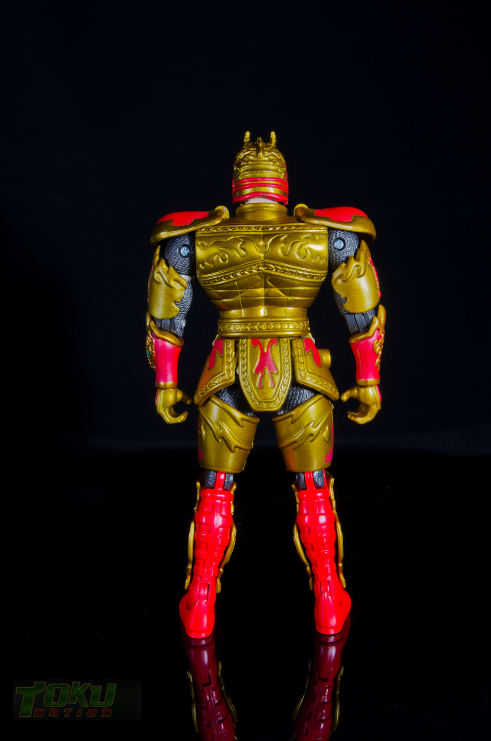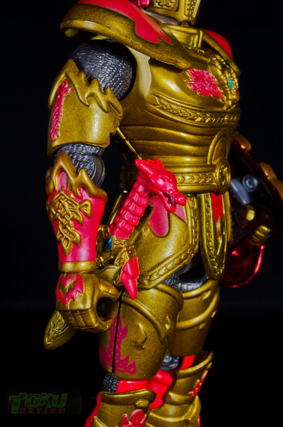 We're back with another gallery featuring Bandai of America's 1998 Mystic Knights of Tir Na Nog line and this time we're taking a look at the 8 inch Rohan, Mystic Knight of Fire. Simply put, everything that the 5 inch Mystic Knights do (you can check out the gallery of 5" Rohan here) the 8 inch figures do better. Rohan features 21 points of articulation, has 18 pieces of removable armor, and comes with The Sword of Kells, a smaller sword, an axe, a Dragon's Breath Dagger, dagger sheath, and a shield. Unlike the 5 inch version, this larger Rohan's shield cannot clip into DX Pyre's chest. Somehow, the designer's managed to accurately capture all of the gorgeous designs and details of the on-screen armor in this figure. Due to the way the chest armor and skirt pieces connect together, the hip/thigh articulation of the figure is not hindered that much. All of the armor pieces attach very securely to the figure and although there are some noticable seams, it holds together well. I would easily recommend the 8 inch versions of the Mystic Knights over their 5 inch counterparts, however, there are two drawbacks. First, it's extremely difficult to find one loose, complete, and for a reasonable price on the secondary market. Secondly, only Rohan, Angus, and Ivar were made in the 8 inch scale, leaving completionists pining for an in-scale Deidre. In the end though, the 8 inch Rohan is the best representation of the Knight of Fire that you can get and I highly recommend it to fans of Mystic Knights of Tir Na Nog, the suits, or just American Toku in general. |