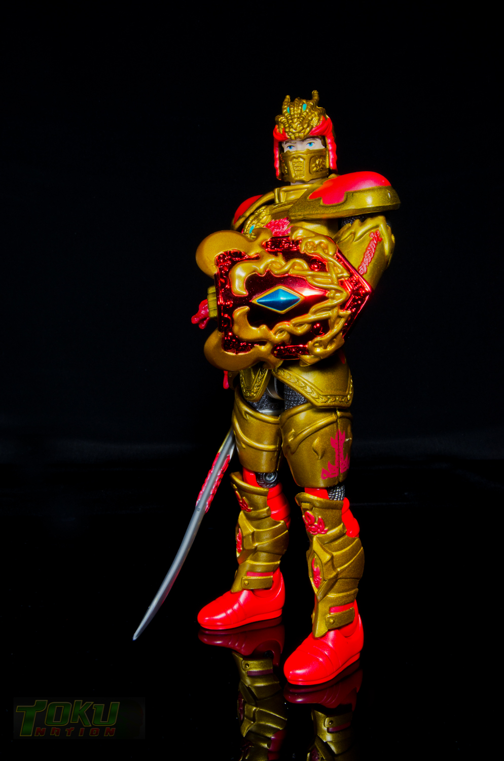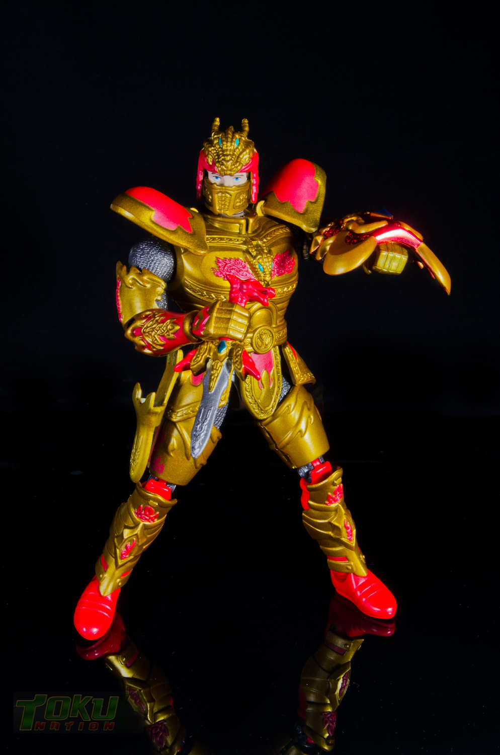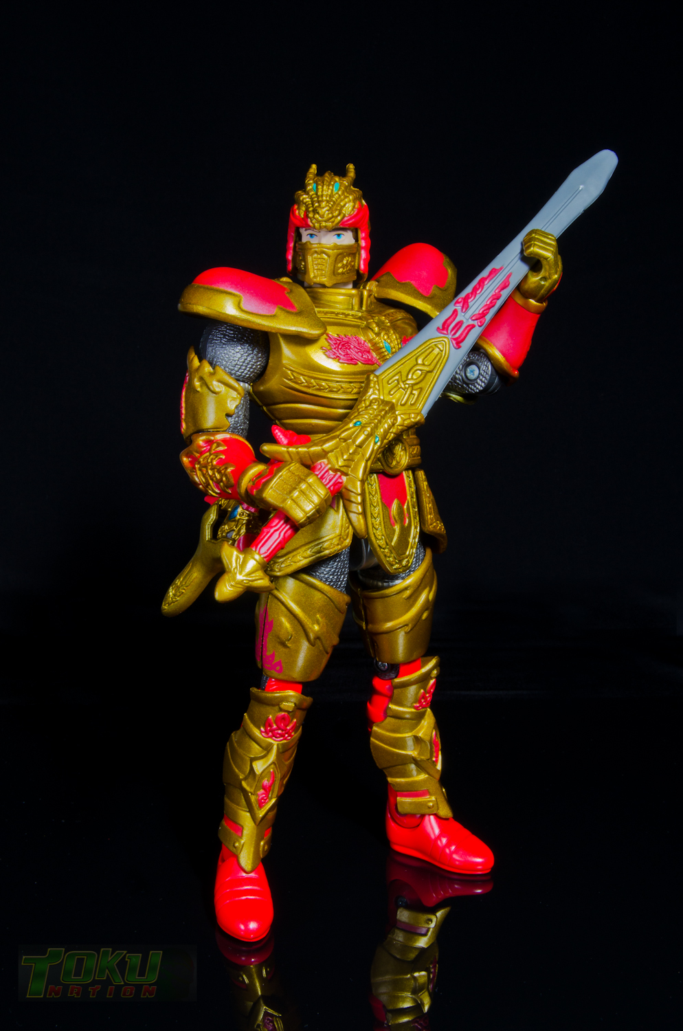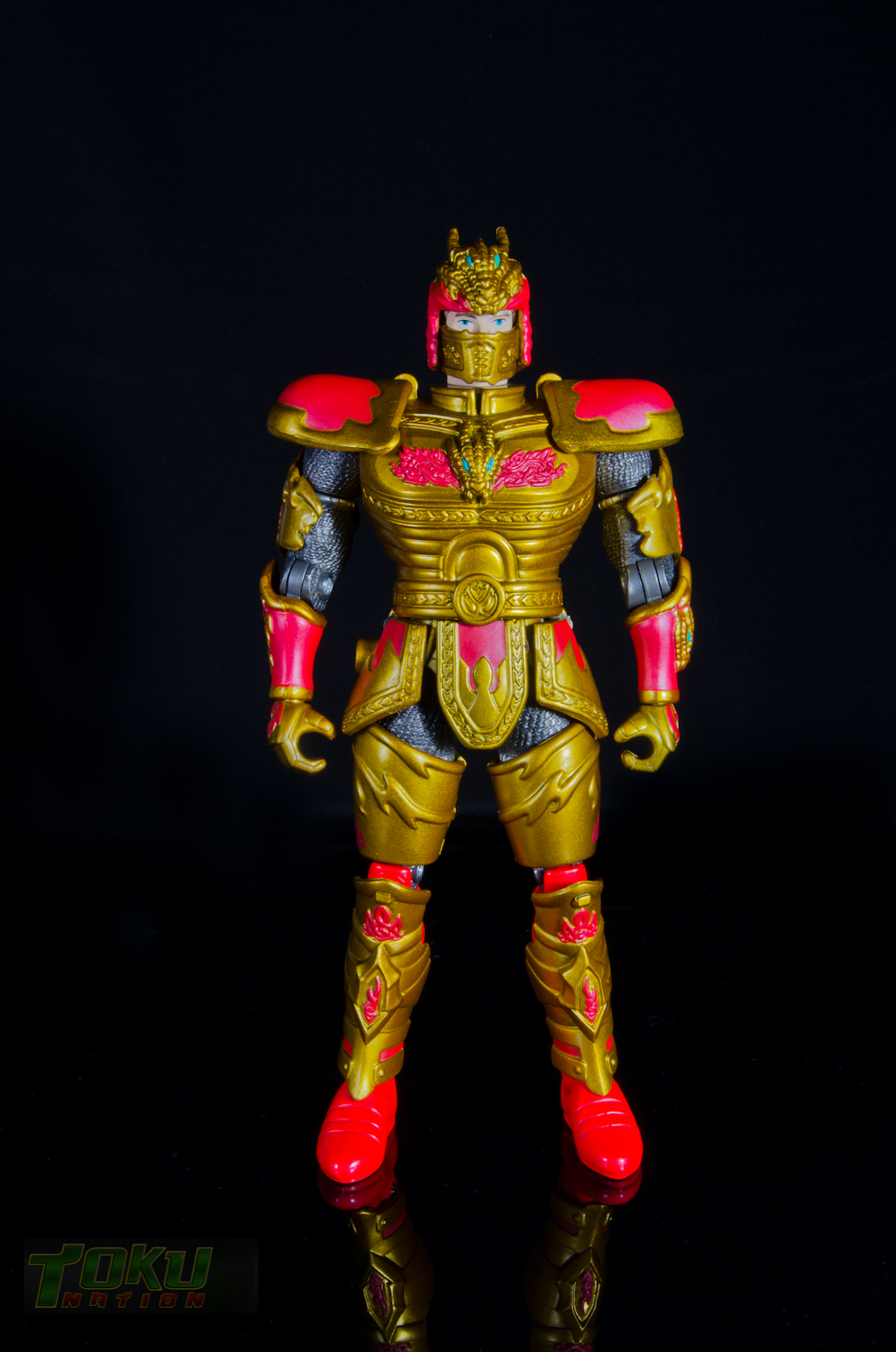 We're back with another gallery featuring Bandai of America's 1998 Mystic Knights of Tir Na Nog line and this time we're taking a look at the 8 inch Rohan, Mystic Knight of Fire. Simply put, everything that the 5 inch Mystic Knights do (you can check out the gallery of 5" Rohan here) the 8 inch figures do better. Rohan features 21 points of articulation, has 18 pieces of removable armor, and comes with The Sword of Kells, a smaller sword, an axe, a Dragon's Breath Dagger, dagger sheath, and a shield. Unlike the 5 inch version, this larger Rohan's shield cannot clip into DX Pyre's chest. Somehow, the designer's managed to accurately capture all of the gorgeous designs and details of the on-screen armor in this figure. Due to the way the chest armor and skirt pieces connect together, the hip/thigh articulation of the figure is not hindered that much. All of the armor pieces attach very securely to the figure and although there are some noticable seams, it holds together well. I would easily recommend the 8 inch versions of the Mystic Knights over their 5 inch counterparts, however, there are two drawbacks. First, it's extremely difficult to find one loose, complete, and for a reasonable price on the secondary market. Secondly, only Rohan, Angus, and Ivar were made in the 8 inch scale, leaving completionists pining for an in-scale Deidre. In the end though, the 8 inch Rohan is the best representation of the Knight of Fire that you can get and I highly recommend it to fans of Mystic Knights of Tir Na Nog, the suits, or just American Toku in general. |