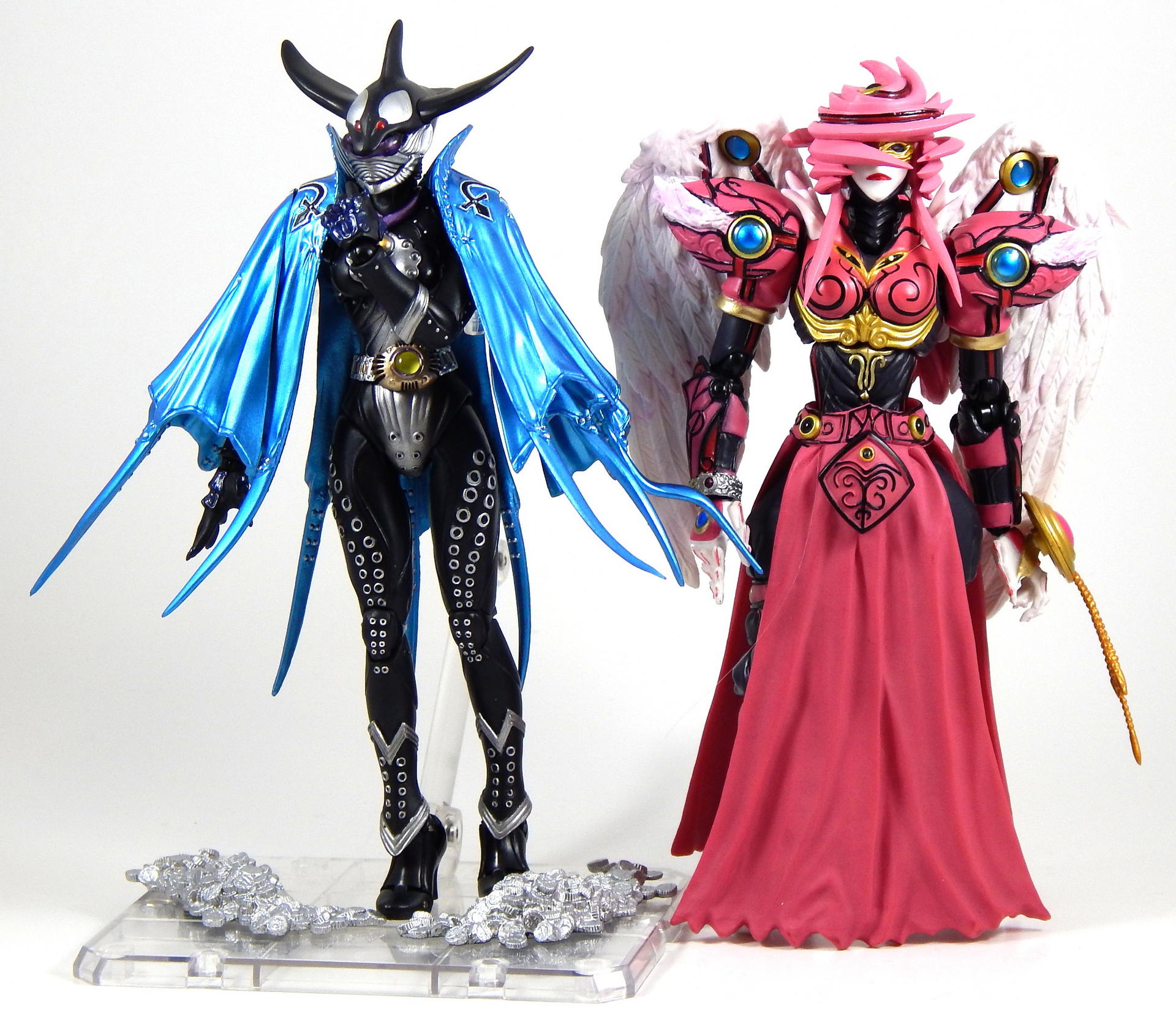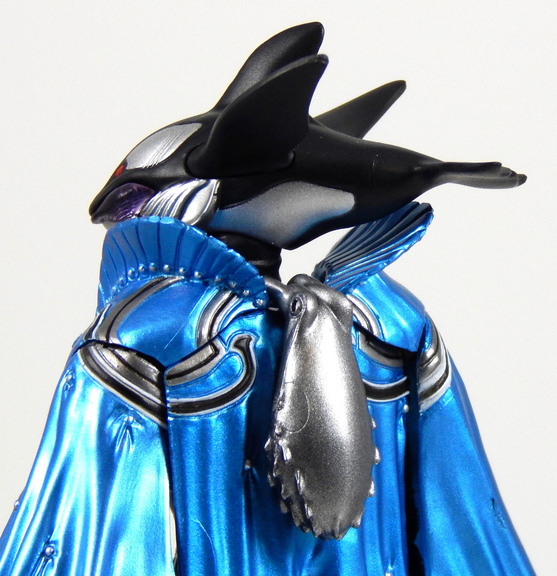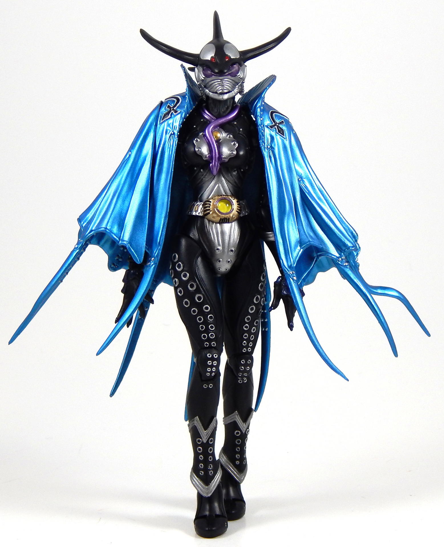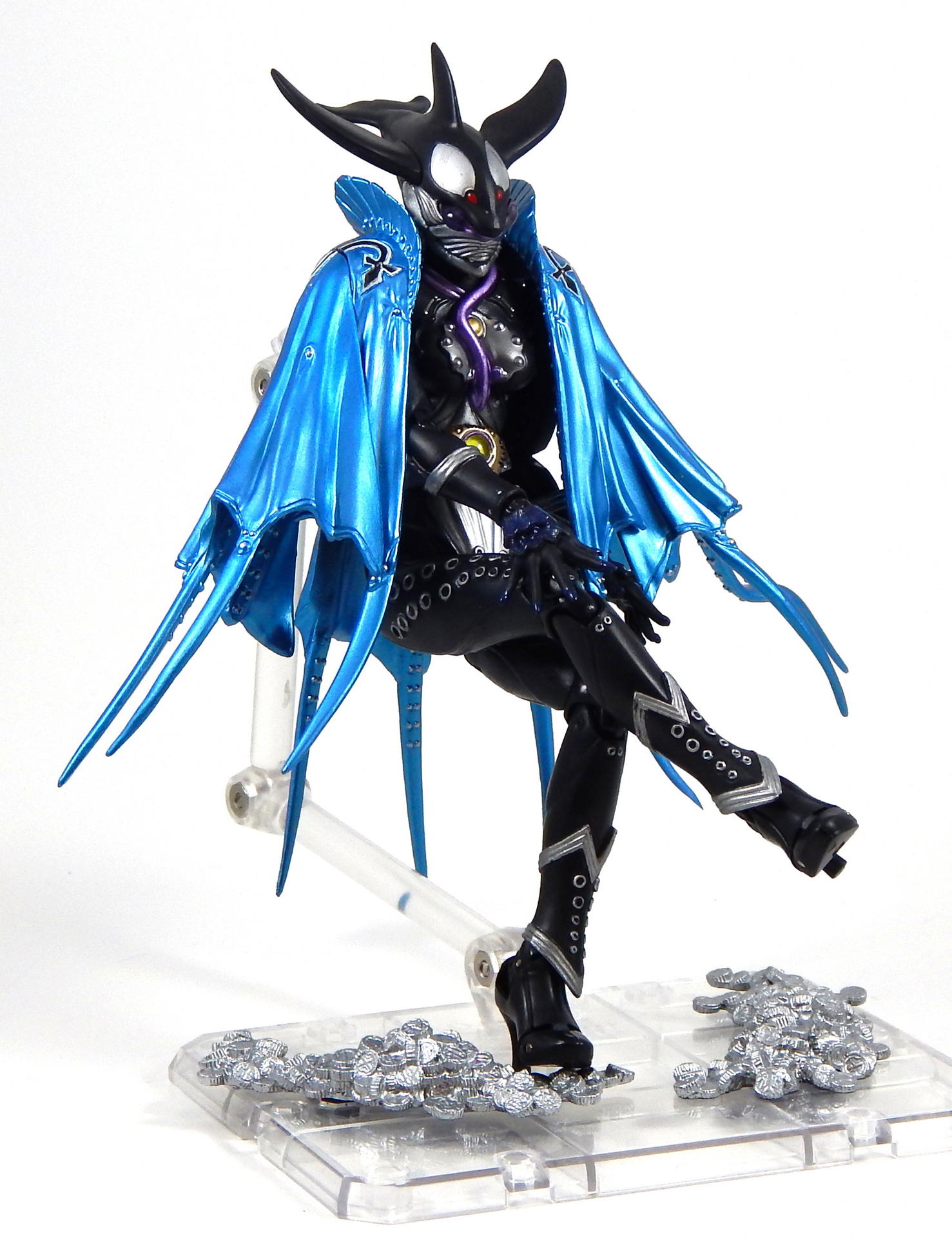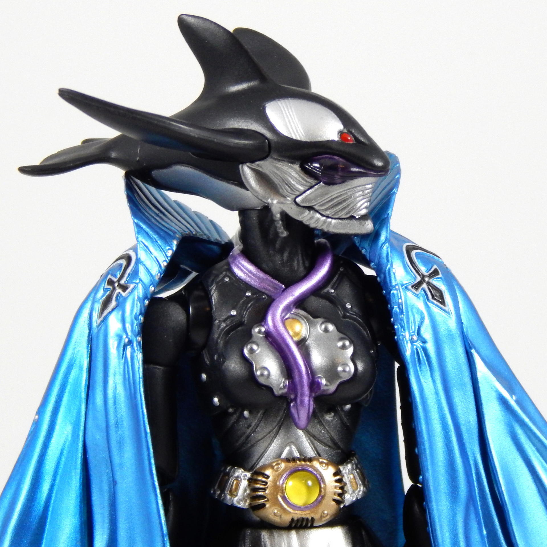 This figure was kind of a pain to shoot for this gallery. Like all of the Greeed Figuarts, I've had it for a year or more, and when I started posing it (for the Uva gallery actually), one side of the cape broke off. The sides of the cape are two pieces, connected by a small plastic hinge, which disintegrated, so there's no chance of repairing it.