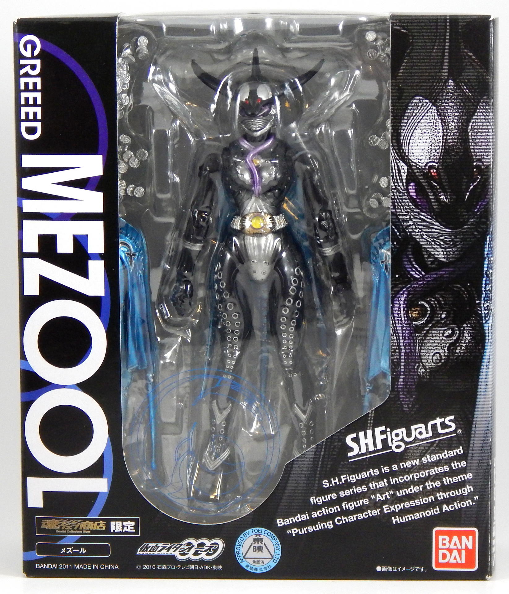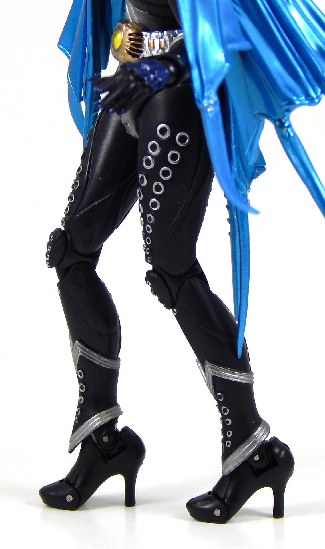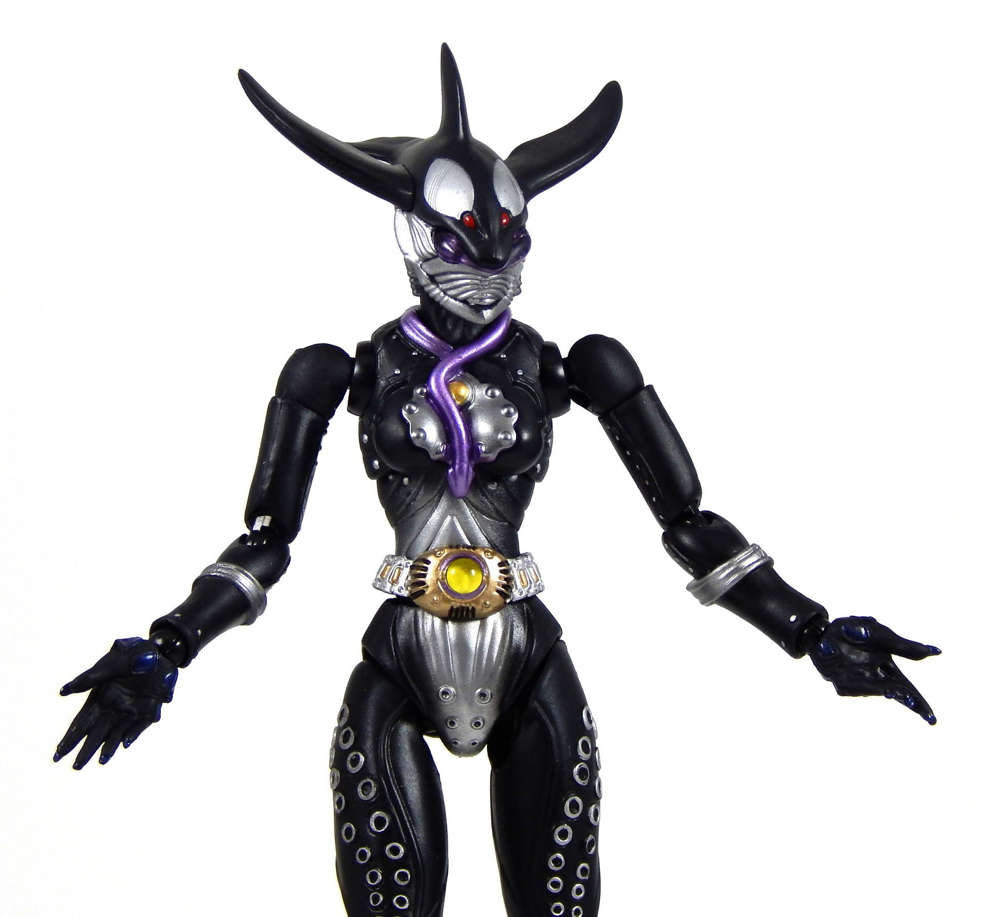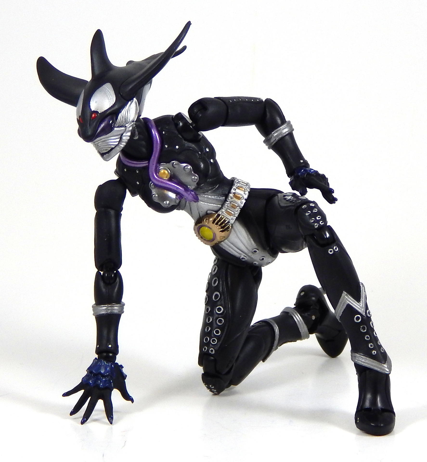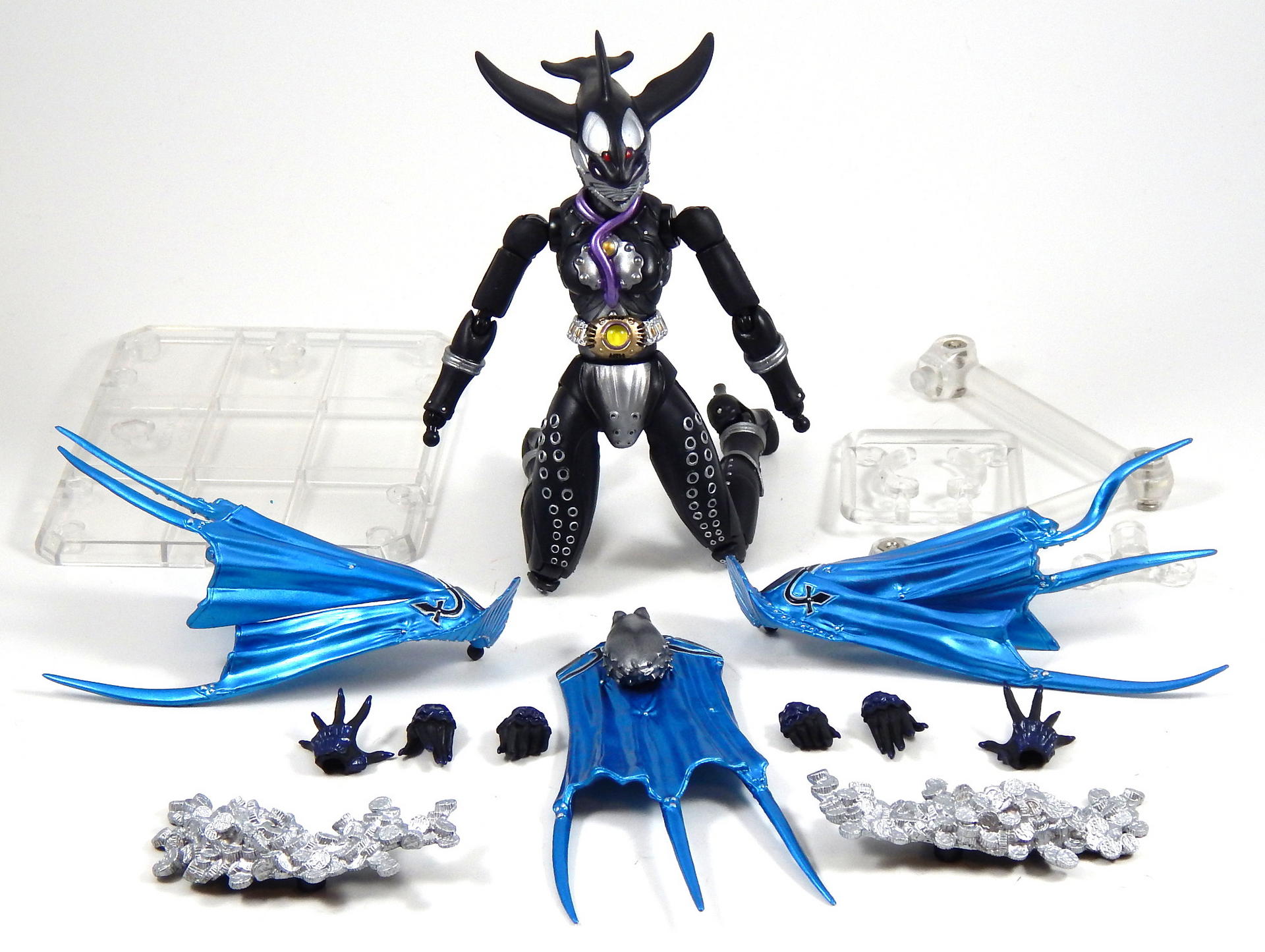 I was pretty upset for a few minutes, then I got on Mandarake and saw that it's current price was almost half of what I originally paid. So I ordered a replacement for 2500 yen plus shipping, and about month later, I received the replacement figure, so I started packing up the original Mezool, in case somebody wanted to buy a broken figure. And the other side of her cape broke off! The hinge just up and broke, same as the first side had done. And the new one didn't quite make me happy either, the upper torso kept popping off, when I was posing it. It doesn't just fall off at the drop of a hat, but it kinda feels like if you move the joint at all, it slowly works its way off the ball. Not exactly a problem, but definitely enough to be irritating when posing her a lot for a gallery. So I swapped top halves with the broken Mezool, and that one stays on better. The new one also was put in the tray wrong at some point (I'd guess at the factory), one of the tails on her cape wasn't in the right place, and got sandwiched around a corner of the tray, so it's got a funny squiggle in it now, which you can see in the pictures. Since I started with problems, I might as well finish them. She is a bit of a pain to balance. It shouldn't be a surprise, since she has thin, lithe legs (which I think look really good) and high heels, with a big funny shaped head and a cape, she's very top heavy. But, you may notice, I didn't have to use the stand for any of the standing poses. It took a few tries, but I could get her to stand with her feet close together, it was just kind of a hassle, and would have been easier had I used the stand. I will definitely use the stand for long term display, but I wanted to show that she could stand on her own. The other issue is that, of course, the cape restricts her arm movement. It's a decent design, made of 5 pieces, so there is room for movement, but they do get in the way, and since I broke the first one, I was somewhat hesitant to try and wrestle with the new one to much. Looking back at the pictures, I don't have one showing how far forward the arms can go with the cape on, because I never tried it. I seem to recall not being disappointed with the articulation when I first got the figure, so I imagine the joints/separations in the cape let her move her arms forward sufficiently, I just didn't do it this time around. Oh, and the belt, it tends to ride up the more you pose her, revealing the separation between the stomach piece and the crotch piece. I was always having to push it down (and I'm sure there are pictures where I didn't notice it had moved.) Alright, enough complaining about the figure, what do I like about SHF Mezool? Quite a lot. The paint is great, as expected. Like Kazari, she has a bunch of silver rings up and down her legs, and silver studs on her arms, and the paint is quite crisp and clean, and really stands out on the matte black of her body. It's hard to see, but her nails, the backs of her hands, and a little of the palms are a really dark, yet glossy blue, it's rather subtle, but looks pretty good. The sculpt is very good. The design is weird, I mean, she's got an orca for a head, an octopus body just hanging off her back, and a purple eel wrapping around her neck and coming to rest between her breasts. It's really rather strange, but I've always kinda liked it, and the figure pulls it off. The legs are nice and shapely. High heels make the leg muscles go a certain way, and the sculpt of Mezool's legs looks right. The cape has lots of folds and ridges and other details that make it look interesting. The articulation of the body underneath the cape is great. With the cape on she can extend her arms all the way out horizontally, though the cape starts looking pretty unnatural, but once both sides had broken off my original figure, I removed the back part of it as well, and just played with the figure like that. The shoulders look kinda crappy, since they have no covering (that was part of the cape's job), but I found the figure to be rather fun to play with, there's nothing to restrict any of the joints, and I've added capeless Mezool to my display shelf, alongside regular Mezool, since she's more free to be put in interesting poses. For example, she can it in chairs without her cape, and I did get caped Mezool into a pretty good sitting pose, with her legs crossed, if I had a stool for her to sit on, she'd look pretty natural. I liked the Greeed as characters, but beyond that, their designs are very interesting, that's one of the driving reasons I wanted the Figuarts, and they do not disappoint, despite all the complaining I did earlier about Mezool. As with Uva and Kazari, Mezool also has clear plastic for the eyes, but unlike them, hers doesn't really catch the light, so it's not particularly interesting looking. She comes with the same cell medal piles as Uva and Kazari, as well as a Tamashii Stage Act 4, 3 pairs of hands, gropey hands for reaching for things, hands that are hard to describe, open palms but closed figures for gesturing at things I guess? Or Karate poses? Or maybe it's for parade waving, I don't know. The last pair isn't quite fists, but kind of angled, with the thumb up like she wants to hold medals between the thumb and forefinger. I really wish I could find the SHF RideVendor so I had some individual cell medals, but it hasn't shown up on Mandarake that I've seen in the last 5 or 6 weeks. Finally, and this is sorta stretching to call it an accessory, because it's an integral part of the character design, she has a cape. It's made out of 3 pieces, back and two sides, and the two sides are comprised of two different cape pieces that are permanently attached to each other via a small plastic hinge that is apparently breakable. Anyway, clearly I talk too much in these reviews so let's wrap it up. I like the figure, it's pretty cheap right now (especially considering she was originally a Tamashii Web exclusive release), but I do ca