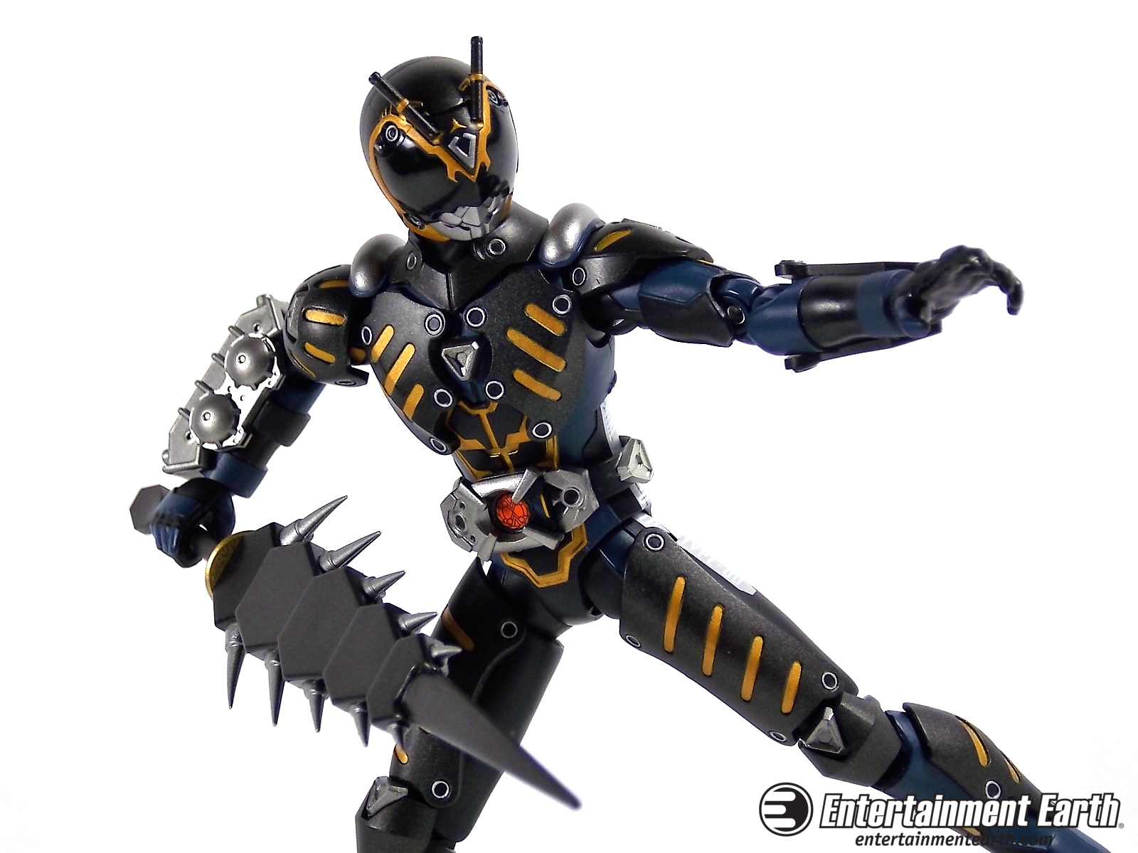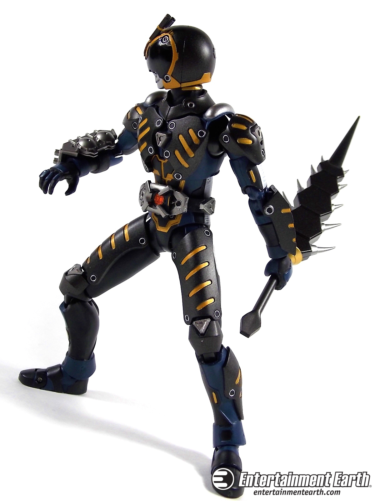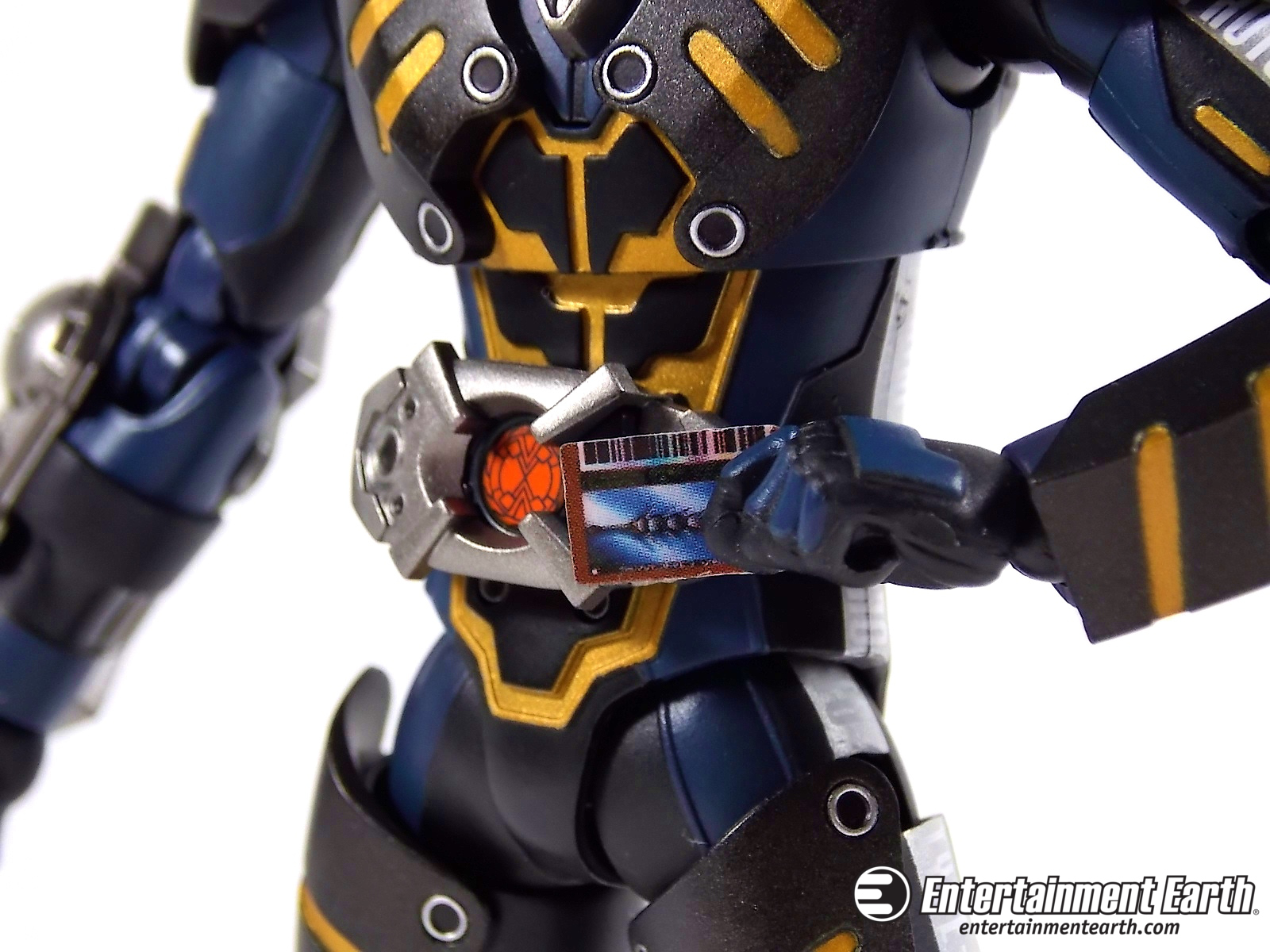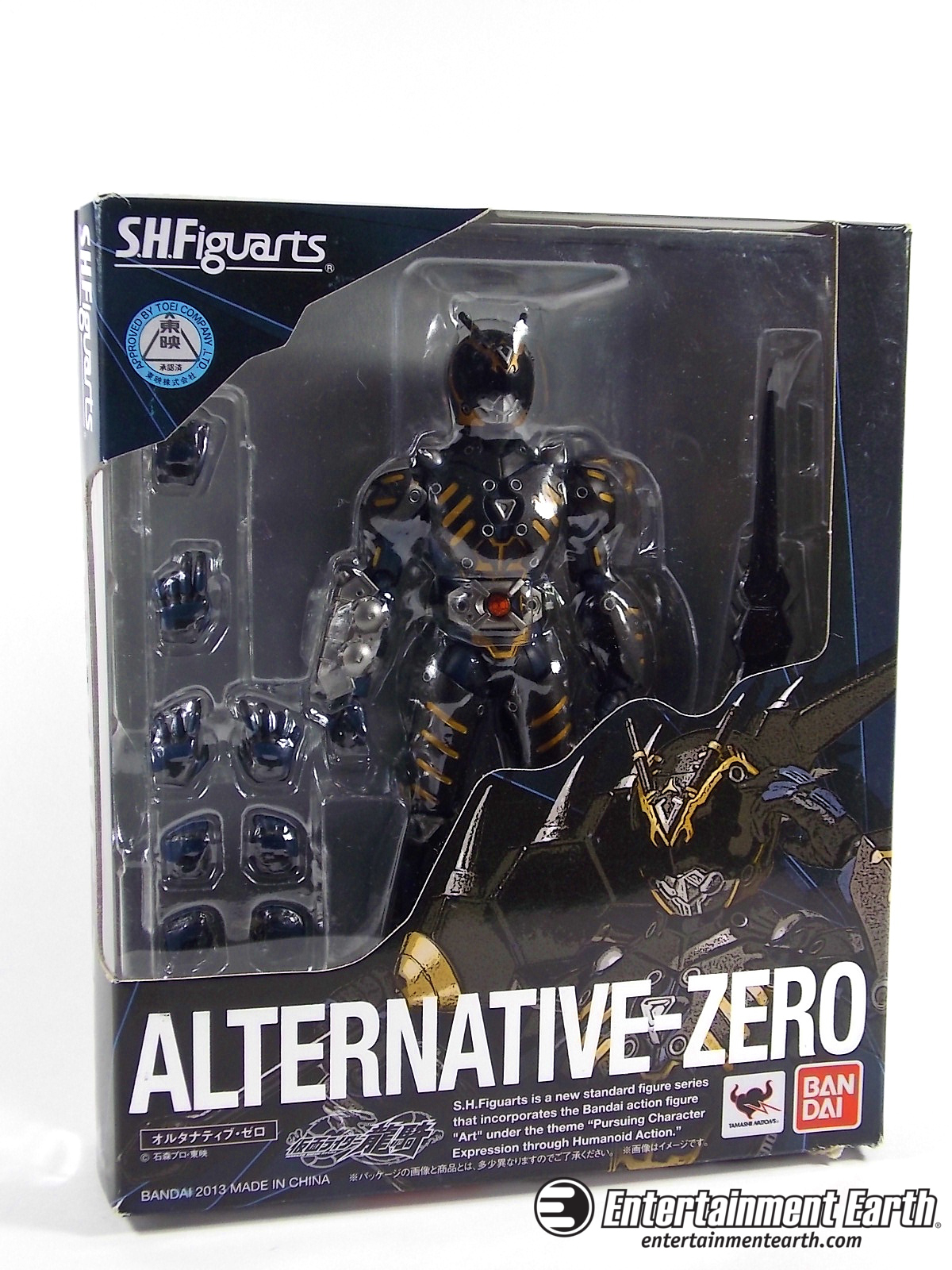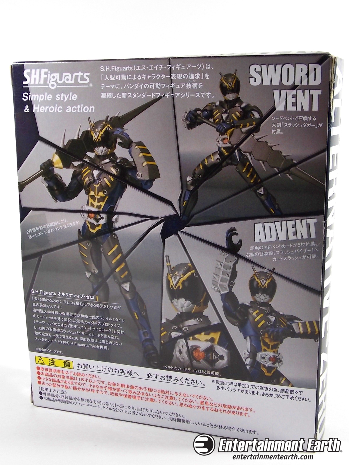We're back with another gallery relating to Kamen Rider Ryuki! We're also happy to report and grateful that today's gallery was made possible by site sponsor Entertainment Earth. A little background. Alternative Zero, or rather the Alternative system itself, was created as an alternative (you see where this is going?) to the Kamen Rider Advent Decks made by Shiro Kanzaki. The mastermind behind this system was Hideyuki Kagawa. Who wound up becoming the user of the Zero system after the destruction of the only other system. Alternative was intended for mass production to counter the riders but only a single MP type, or simply 'Alternative', was ever made and subsequently destroyed. Leaving only Professor Kagawa and his Alternative Zero prototype system to fight the riders. An instigator of battles, even a victor of some, Kagawa as Zero would eventually meet his end at the hands of his twisted student Kamen Rider Tiger. All in the name of misguided heroism. As an S.H. Figuart Alternative Zero is absolutely gorgeous. Being one of the most intricately designed suits in Kamen Rider Ryuki, Alternative make this transition flawlessly. You'll notice that because this is Alternative Zero and not the standardized Alternative for mass production, that the prototype markings are still present on the suit. Down the rib cage and waste you'll see "prototype-00" tampographed on. The recently announced S.H. Figuarts Alternative will lack the proto applications and have a few minor paint apps that differentiate it from Zero. Just as in the show. Did I mention this figure is awesome? Despite being a very armored up character the articulation is superb. Perhaps the only hindrance is that the shoulder pads aren't on any sort of hinge. So it's best to swing the arm out somewhat before trying to pose it, so as not to knock the pad into the main body. An interesting byproduct of this figures articulation is that it can seriously hyper extend it's knees back allowing for some really dynamic posing. The headsculpt is dead on as well right down to the beautiful glossy black visor. Alternative Zero of course includes the regular compliment of extra hands as well as his trusty Sword Vent weapon, the spikes of which are quite sharp. And of course what would an S.H. Figuarts Ryuki release be without advent cards! Alternative Zero includes 5 Advent cards and just like his rider counterparts these cards can be "scanned" through his Slash visor, mounted on the right forearm. The included cards are: